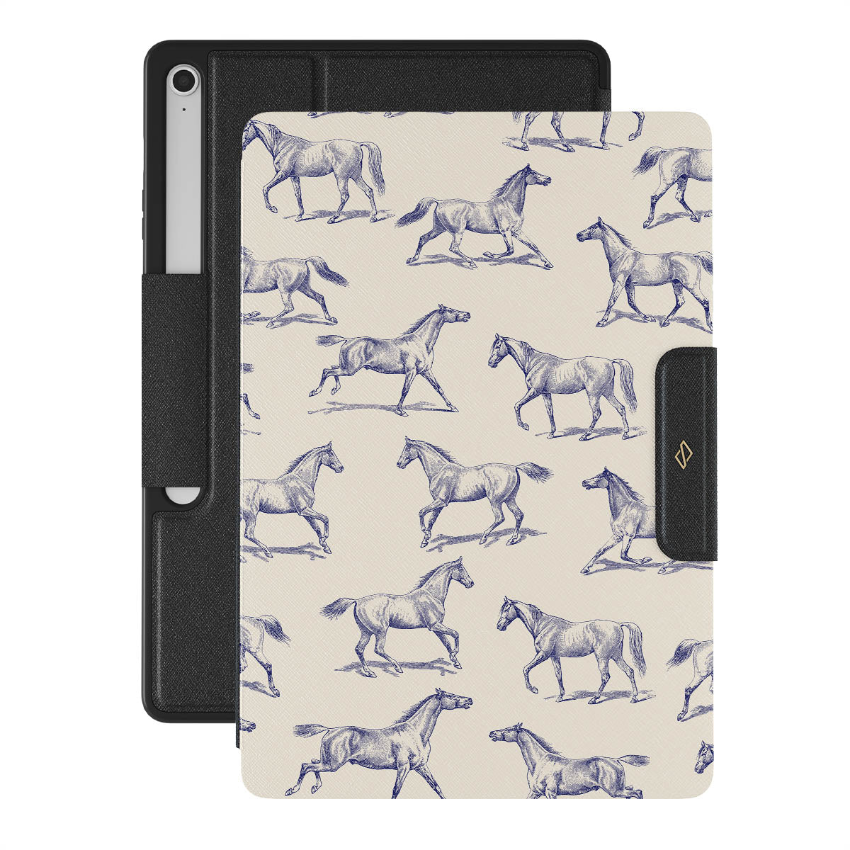 Introducing our Derby Race Samsung Galaxy Tab S10+ FE folio case design—a portrait of elegance in motion on a soft nude canvas. Engraved in delicate blue contours, galloping horses dance upon the wind, frozen in an exquisite moment of grace.