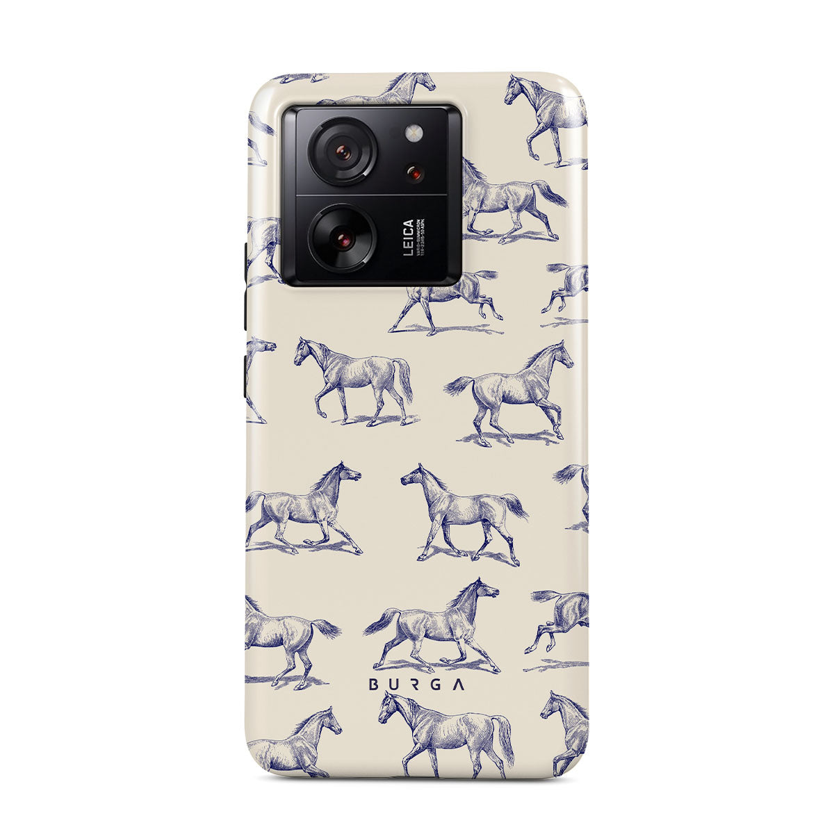 Introducing our Derby Race Xiaomi 13T phone case design—a portrait of elegance in motion on a soft nude canvas. Engraved in delicate blue contours, galloping horses dance upon the wind, frozen in an exquisite moment of grace.