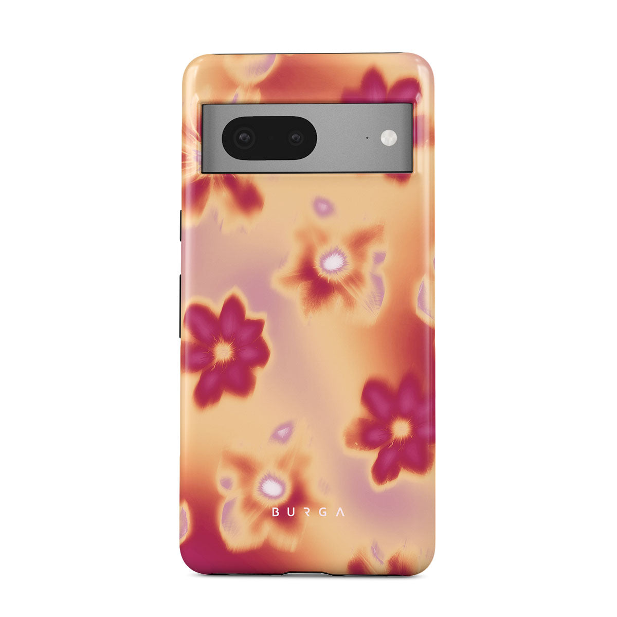 Get lost in the allure of our Divine Google Pixel 7a phone case design. Picture blossoms bathed in fiery hues of pink and orange, each seemingly charged with life's raw energy. Set against a canvas that radiates power and warmth, these flowers offer more than just beauty; they resonate with the essence that binds us all.