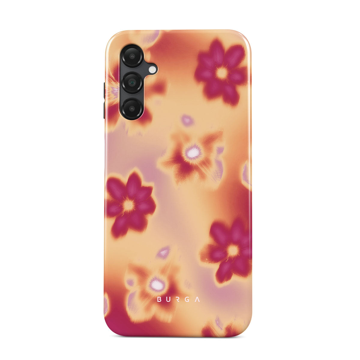 Get lost in the allure of our Divine Samsung Galaxy A14 5G phone case design. Picture blossoms bathed in fiery hues of pink and orange, each seemingly charged with life's raw energy. Set against a canvas that radiates power and warmth, these flowers offer more than just beauty; they resonate with the essence that binds us all.