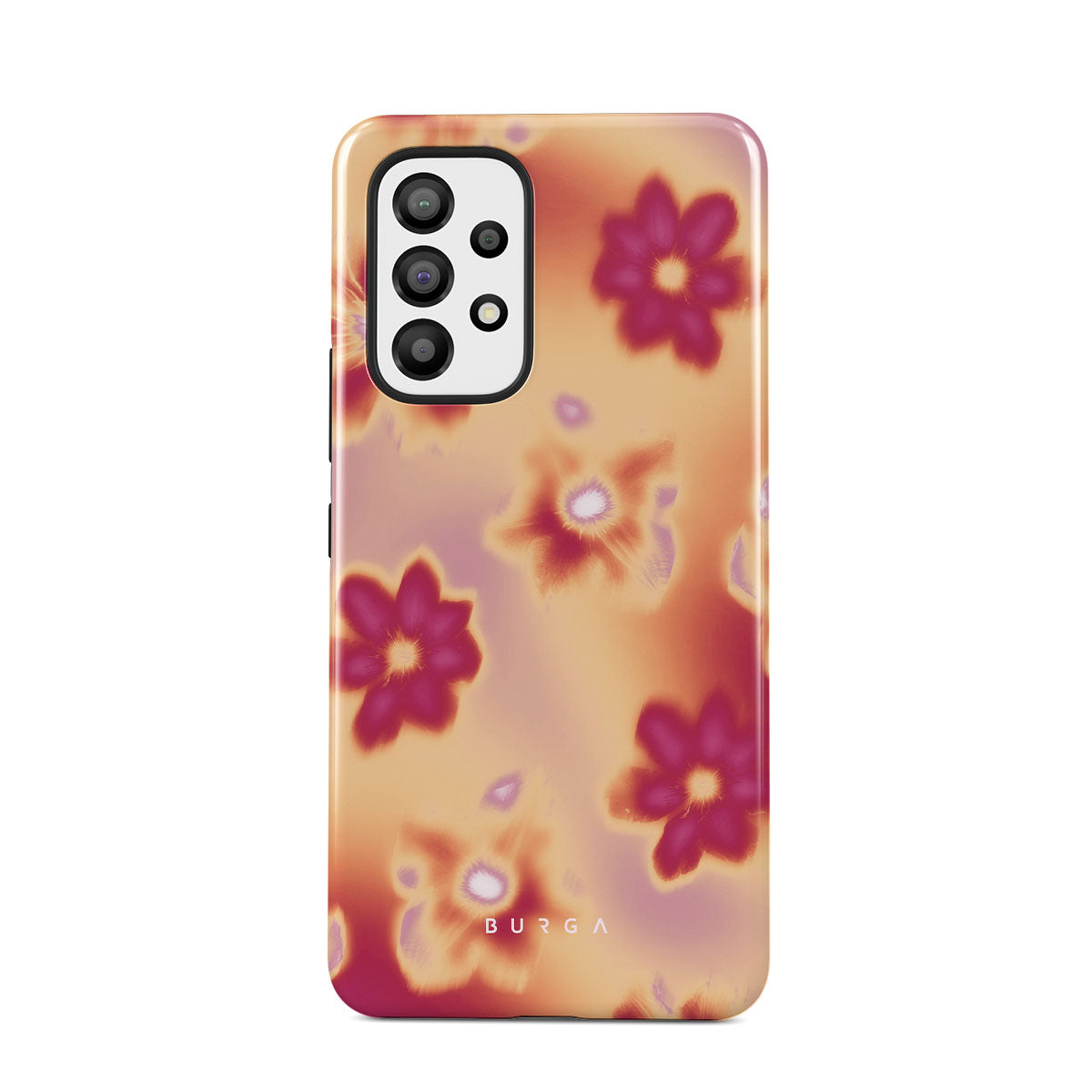 Get lost in the allure of our Divine Samsung Galaxy A53 phone case design. Picture blossoms bathed in fiery hues of pink and orange, each seemingly charged with life's raw energy. Set against a canvas that radiates power and warmth, these flowers offer more than just beauty; they resonate with the essence that binds us all.
