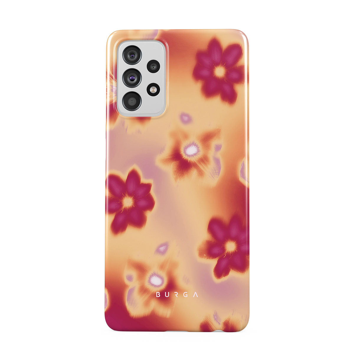Get lost in the allure of our Divine Samsung Galaxy A72 4G / 5G phone case design. Picture blossoms bathed in fiery hues of pink and orange, each seemingly charged with life's raw energy. Set against a canvas that radiates power and warmth, these flowers offer more than just beauty; they resonate with the essence that binds us all.