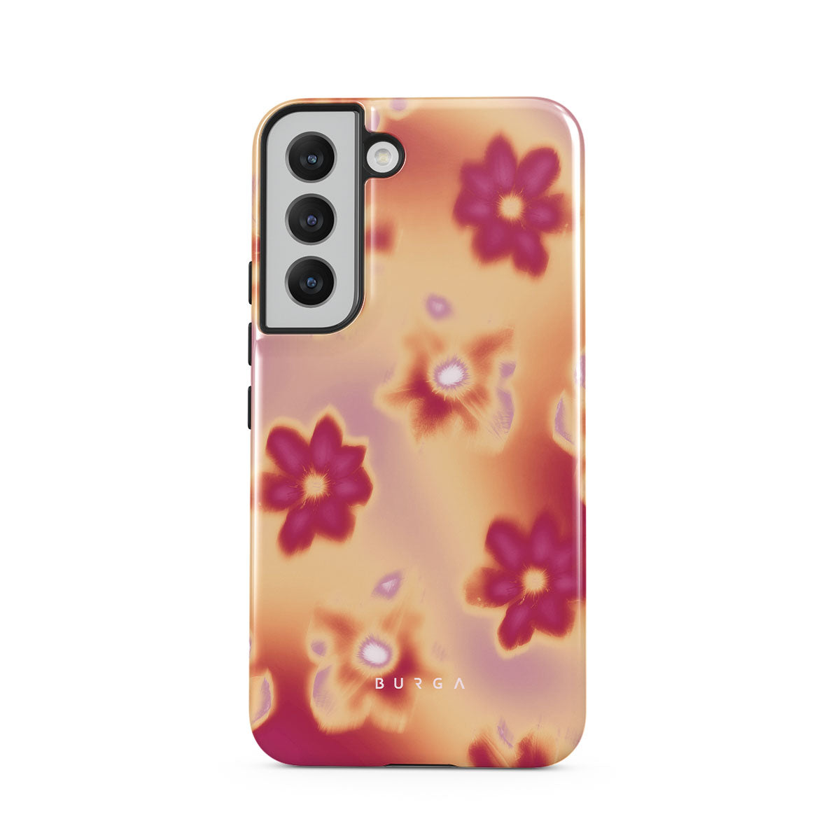 Get lost in the allure of our Divine Samsung Galaxy S22 phone case design. Picture blossoms bathed in fiery hues of pink and orange, each seemingly charged with life's raw energy. Set against a canvas that radiates power and warmth, these flowers offer more than just beauty; they resonate with the essence that binds us all.