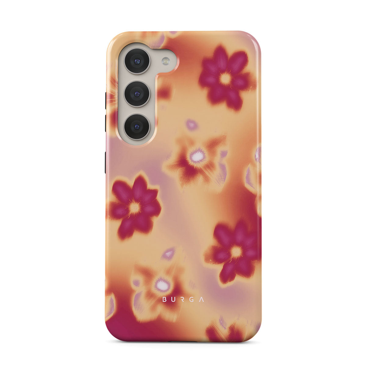 Get lost in the allure of our Divine Samsung Galaxy S23 phone case design. Picture blossoms bathed in fiery hues of pink and orange, each seemingly charged with life's raw energy. Set against a canvas that radiates power and warmth, these flowers offer more than just beauty; they resonate with the essence that binds us all.