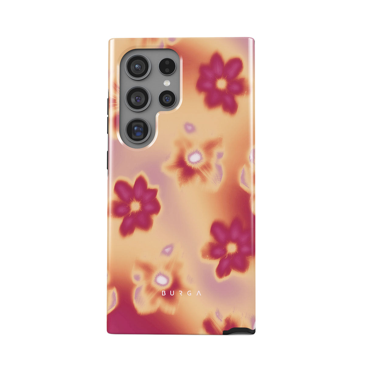 Get lost in the allure of our Divine Samsung Galaxy S24 Ultra phone case design. Picture blossoms bathed in fiery hues of pink and orange, each seemingly charged with life's raw energy. Set against a canvas that radiates power and warmth, these flowers offer more than just beauty; they resonate with the essence that binds us all.