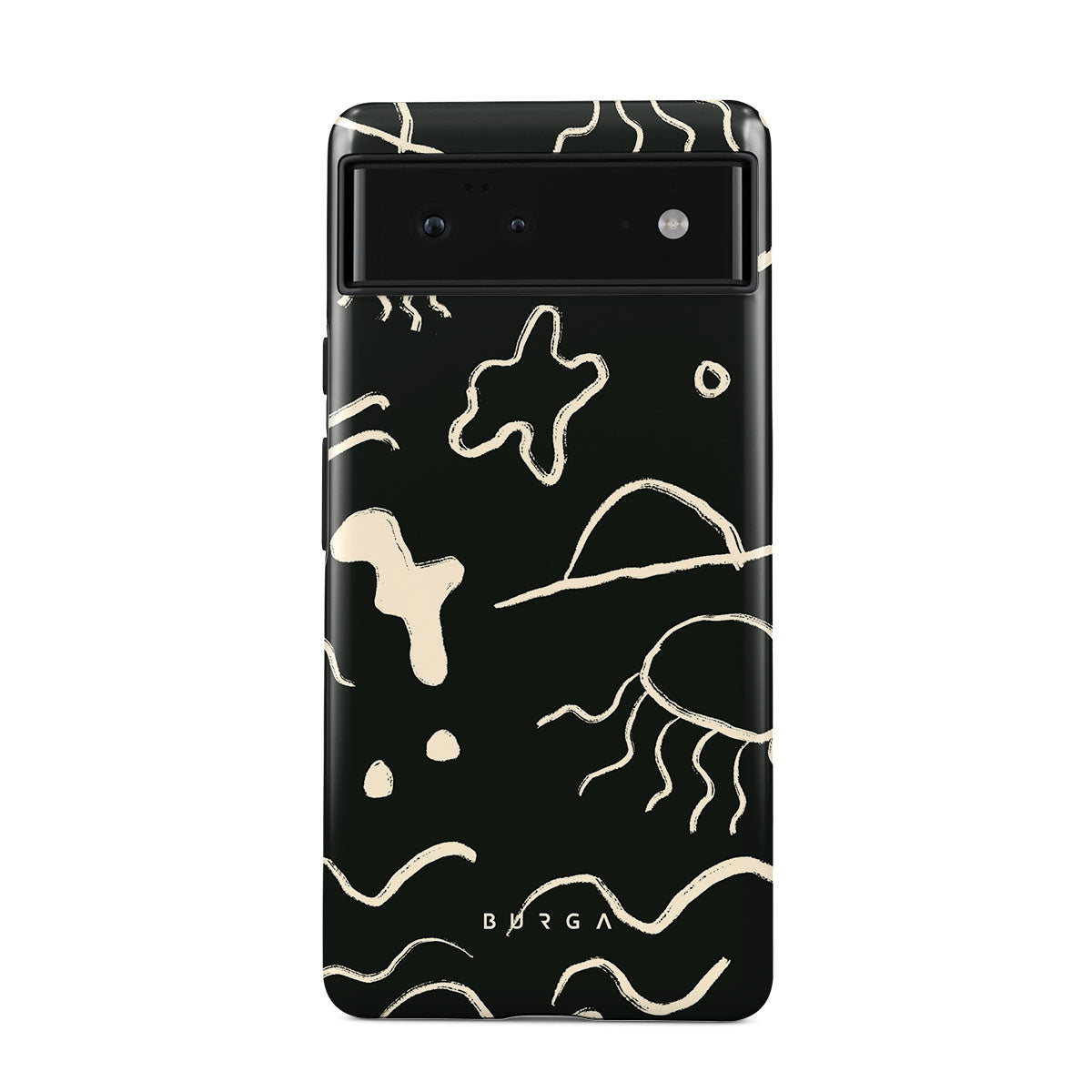 Our Eclipse Google Pixel 6 design reflects the enigmatic beauty of the ocean during a solar eclipse. The dark hues and bright accents represent how the light dances on the water, while the waves and jellyfish capture the serene yet dynamic nature of the ocean.