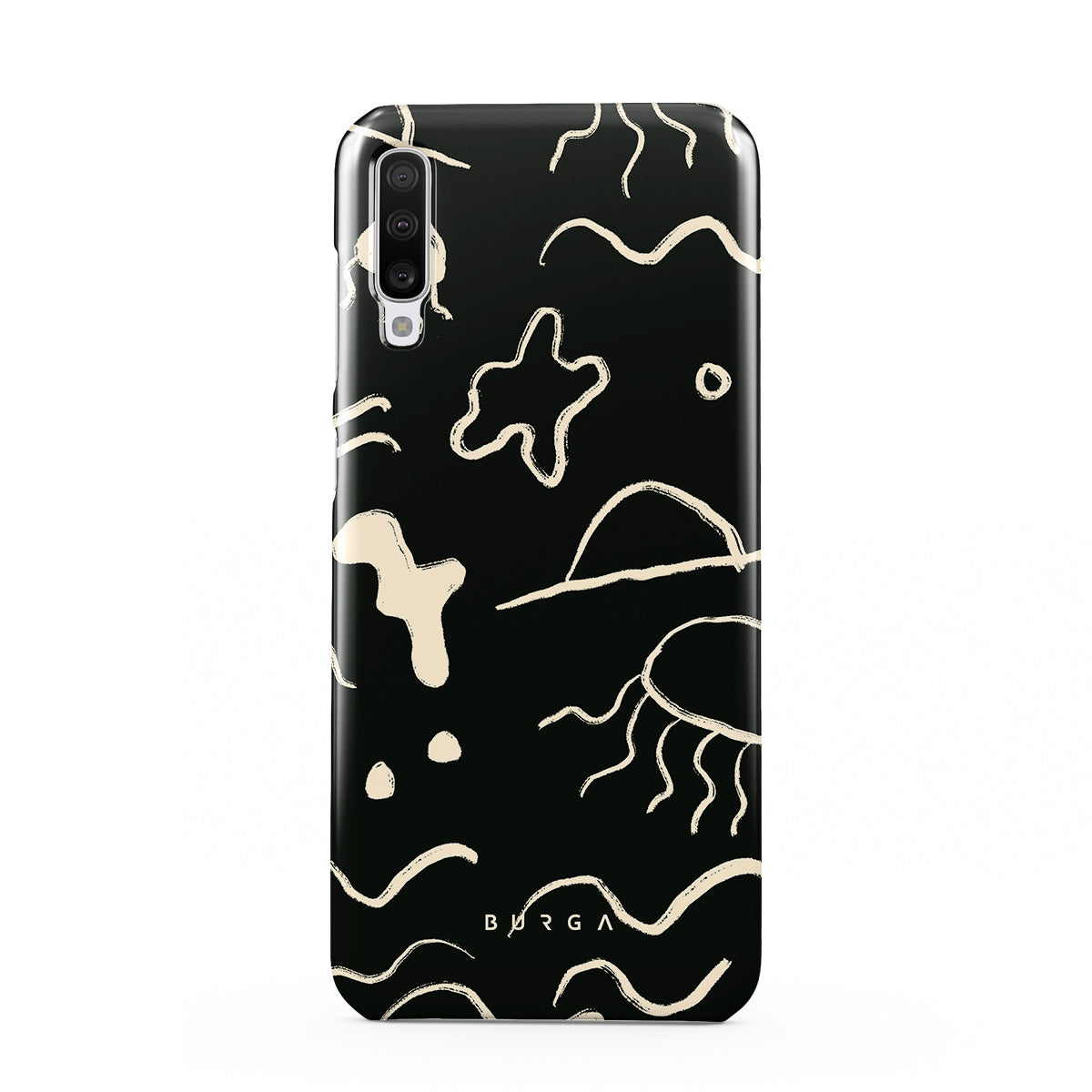 Our Eclipse Samsung Galaxy A70 design reflects the enigmatic beauty of the ocean during a solar eclipse. The dark hues and bright accents represent how the light dances on the water, while the waves and jellyfish capture the serene yet dynamic nature of the ocean.