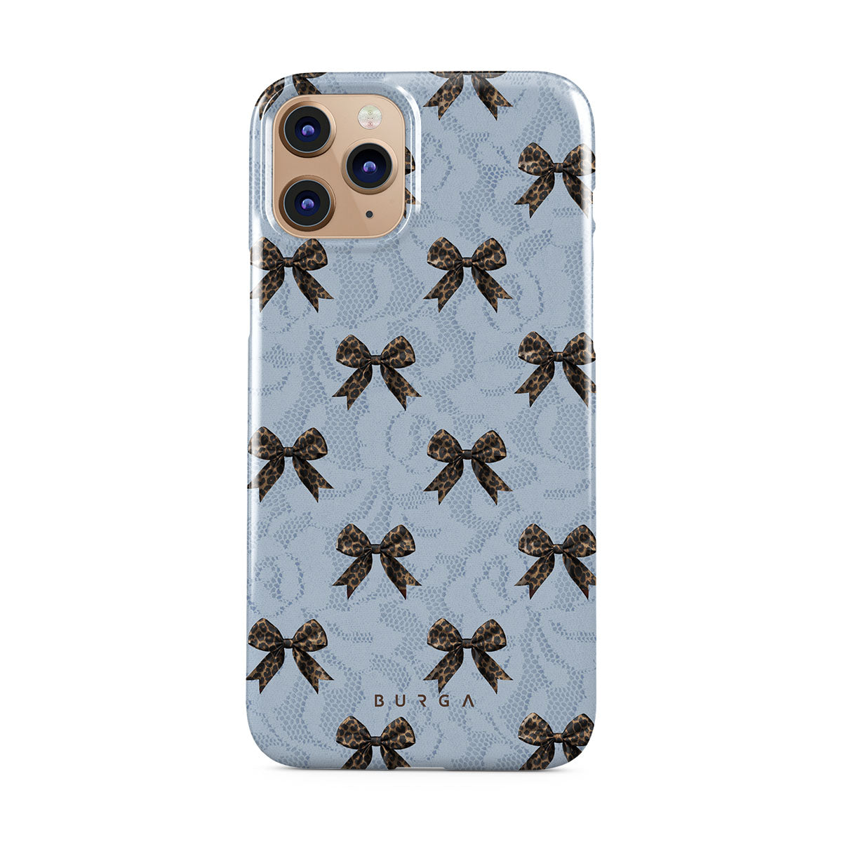 For those who command attention with subtle elegance, our Fashionista iPhone 11 Pro phone case design is your go-to. A soft blue background, accented by dark grey bows and subtle lace patterns, exudes polished, effortless style. It's quiet confidence with a hint of charm.