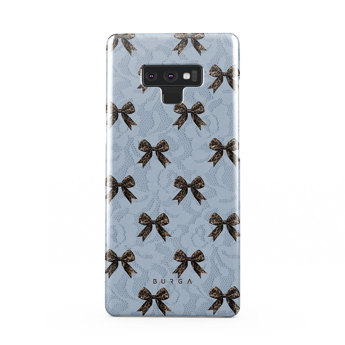 For those who command attention with subtle elegance, our Fashionista Samsung Galaxy Note 9 phone case design is your go-to. A soft blue background, accented by dark grey bows and subtle lace patterns, exudes polished, effortless style. It's quiet confidence with a hint of charm.