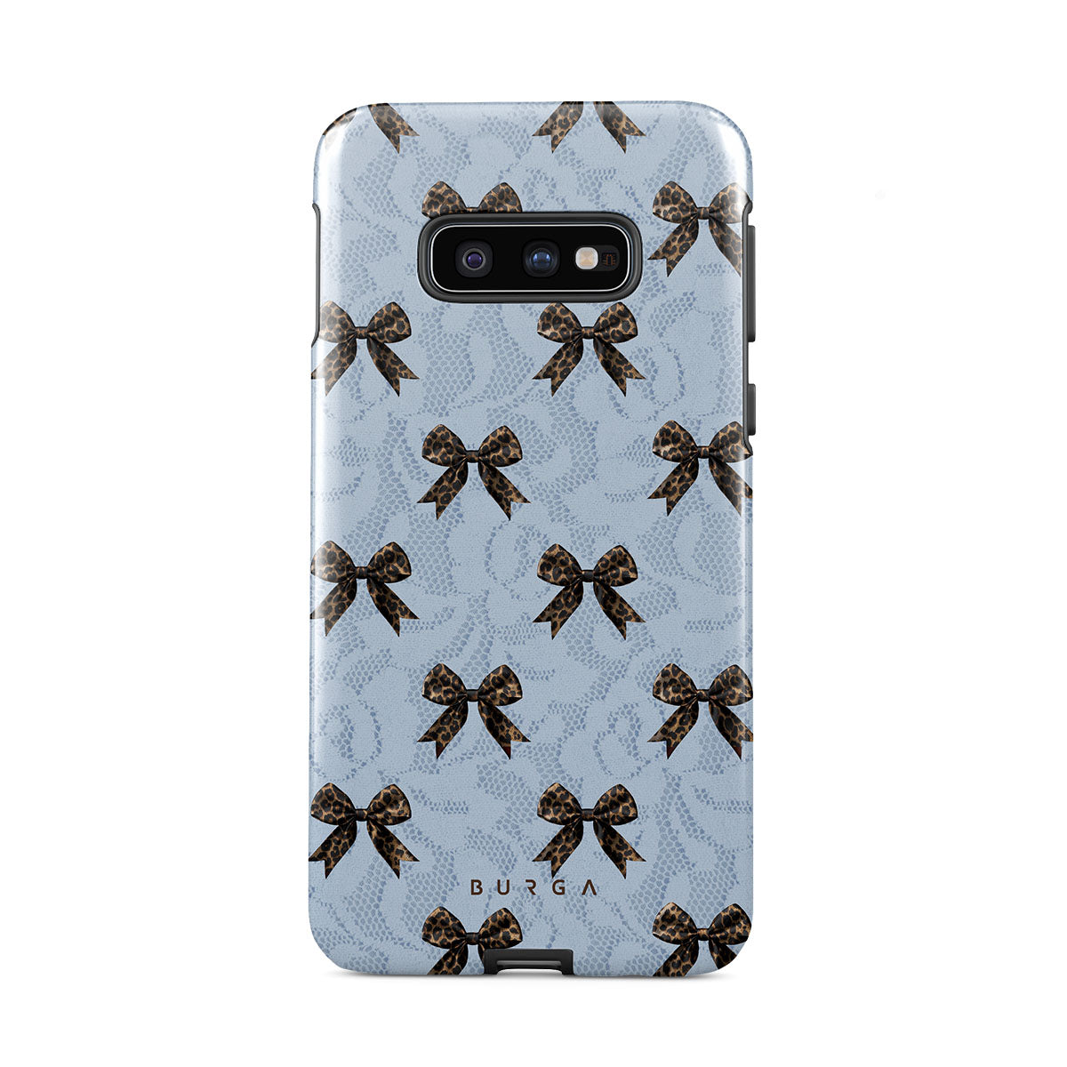 For those who command attention with subtle elegance, our Fashionista Samsung Galaxy S10E phone case design is your go-to. A soft blue background, accented by dark grey bows and subtle lace patterns, exudes polished, effortless style. It's quiet confidence with a hint of charm.