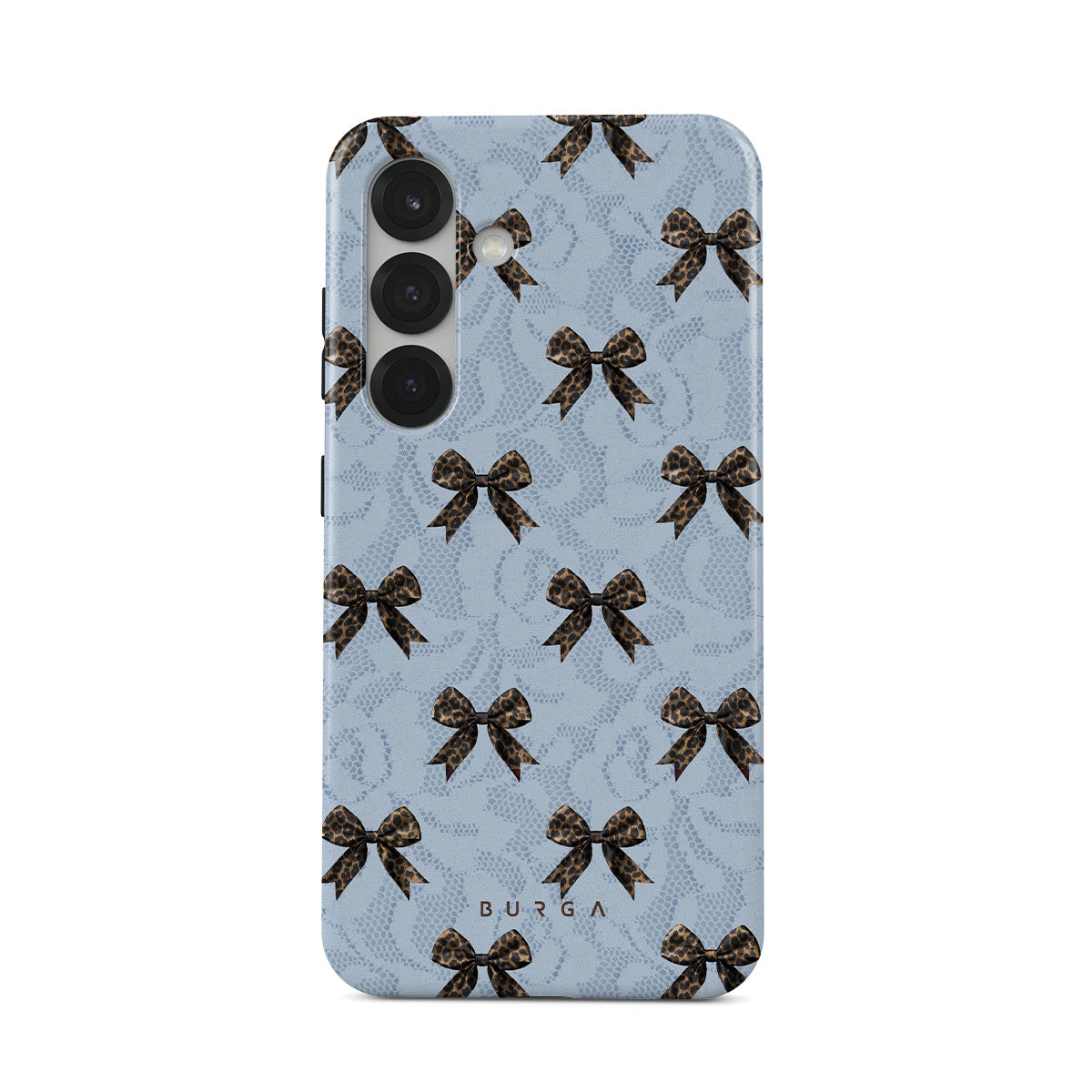 For those who command attention with subtle elegance, our Fashionista Samsung Galaxy S25 Plus phone case design is your go-to. A soft blue background, accented by dark grey bows and subtle lace patterns, exudes polished, effortless style. It's quiet confidence with a hint of charm.
