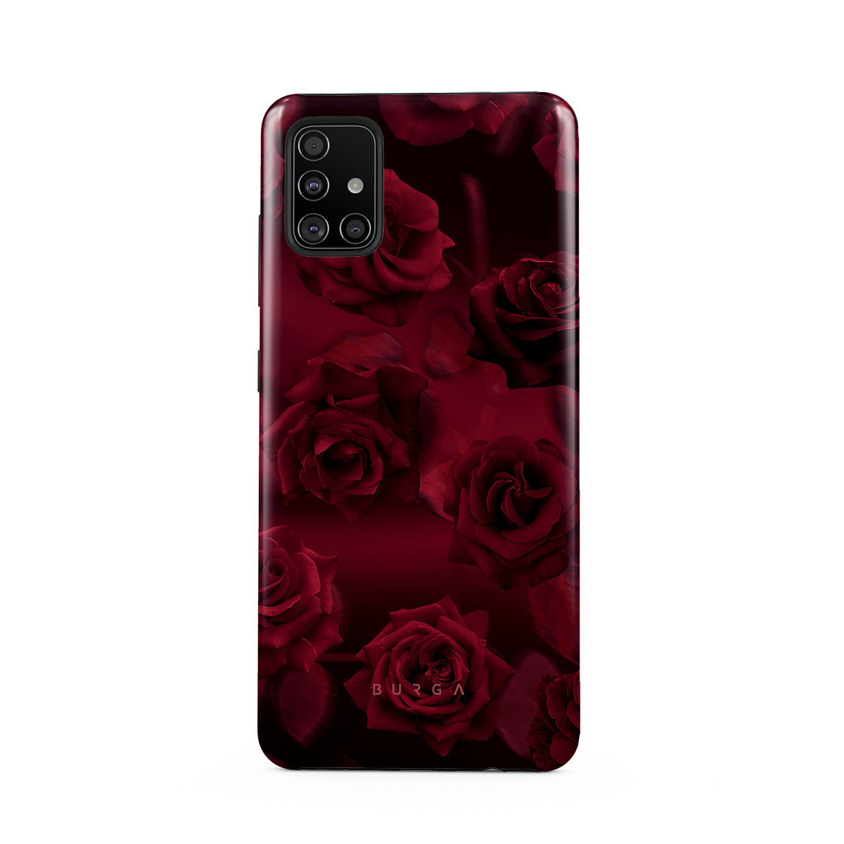 Dive into our intriguing Femme Fatale Samsung Galaxy A71 4G phone case design. These deep red roses aren't just flowers—they're silent confessions of candlelit romance and moments caught in stolen glances. Crafted for those who captivate at every turn.