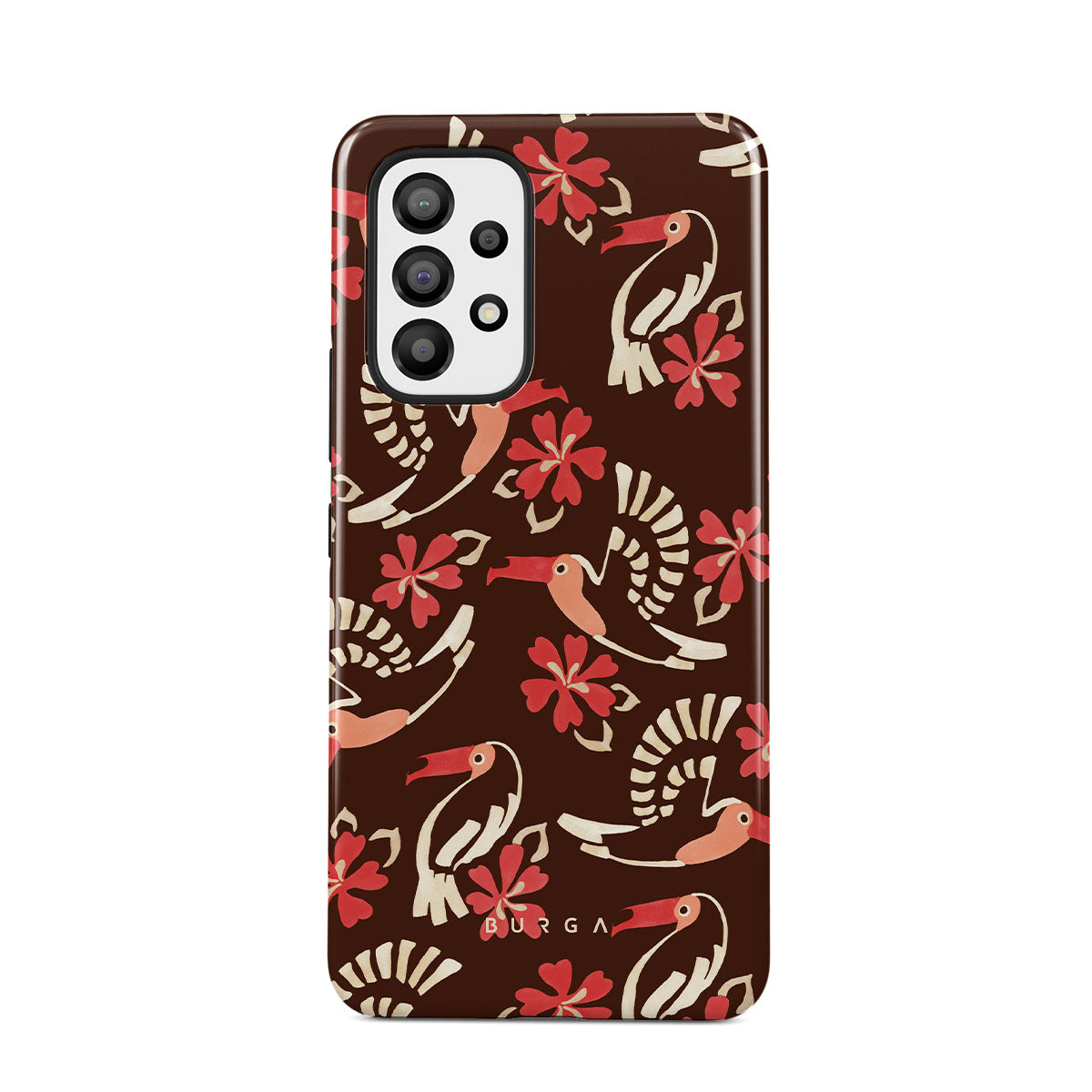 A jungle rave. Parrots, florals, bursts of red and cream—like someone threw a party in the rainforest and forgot to send you the invite. This Samsung Galaxy A14 5G phone case design is your RSVP.