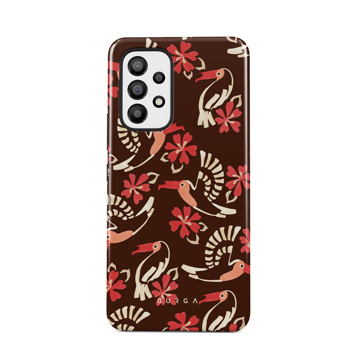 A jungle rave. Parrots, florals, bursts of red and cream—like someone threw a party in the rainforest and forgot to send you the invite. This Samsung Galaxy A53 phone case design is your RSVP.