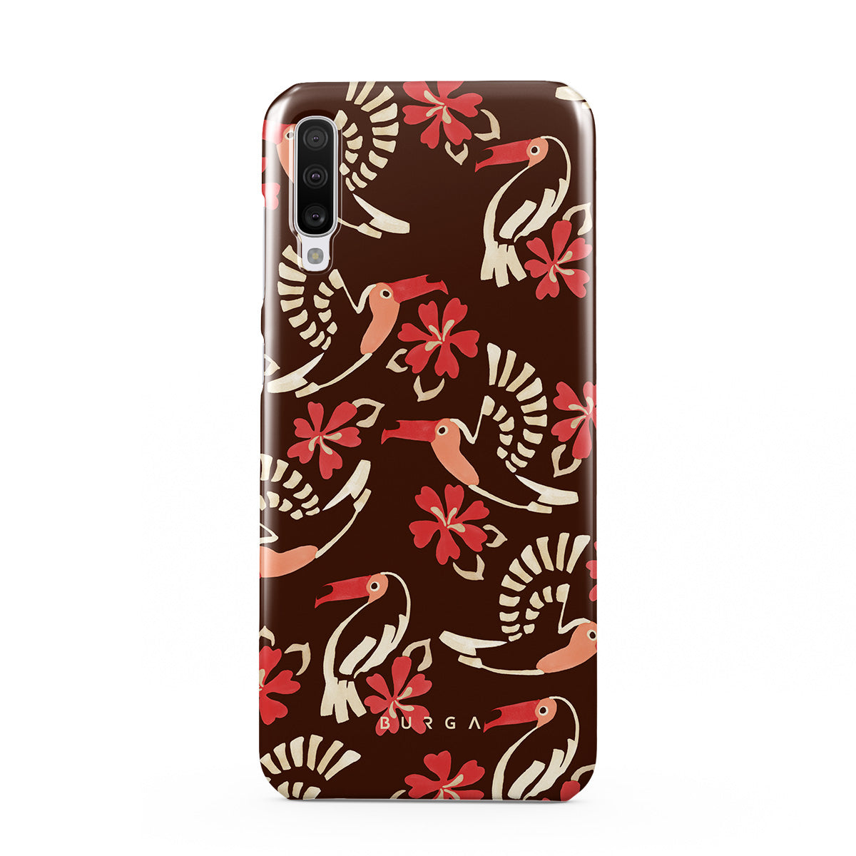 A jungle rave. Parrots, florals, bursts of red and cream—like someone threw a party in the rainforest and forgot to send you the invite. This Samsung Galaxy A70 phone case design is your RSVP.