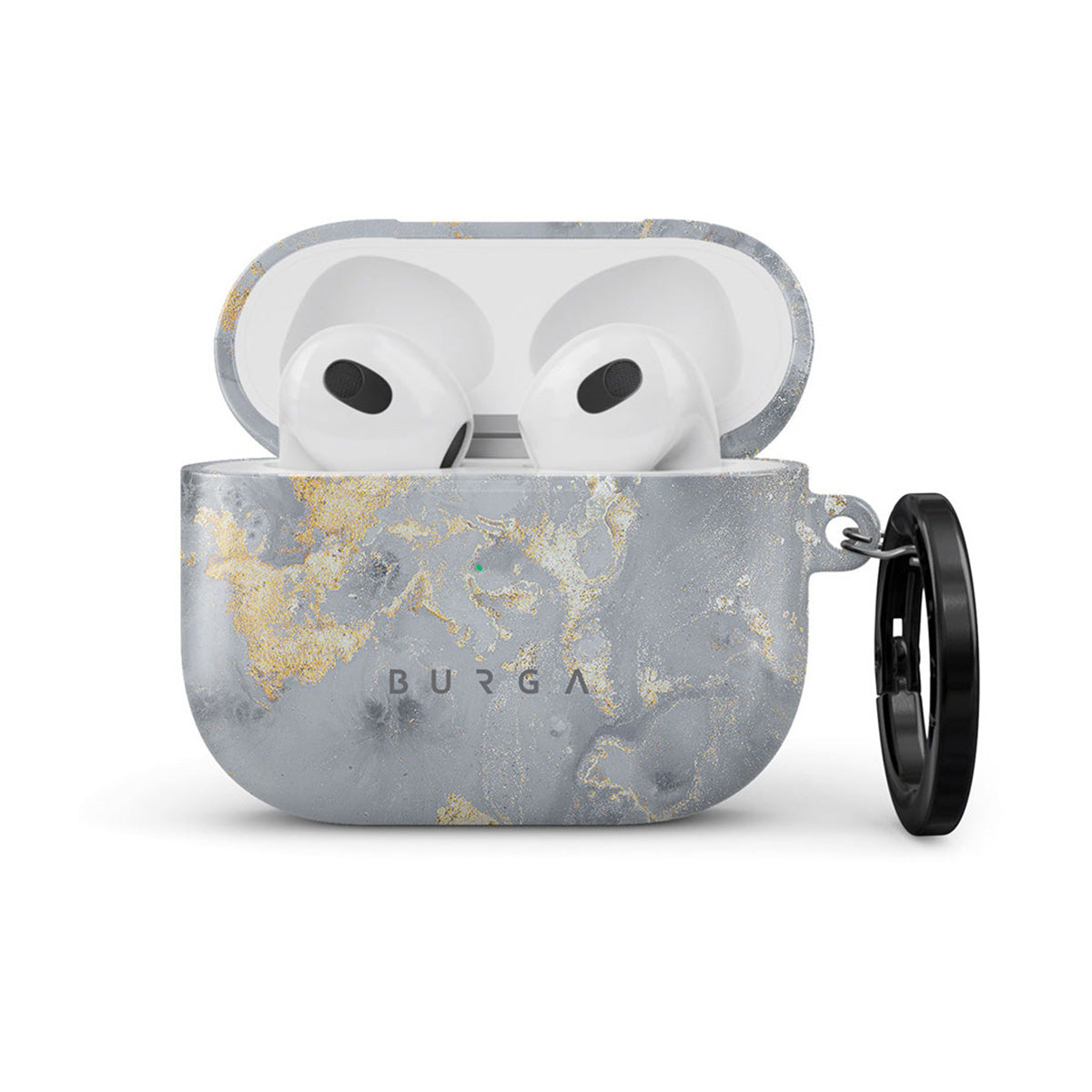 The soft gray color scheme with the golden specks creates an Apple Airpods 3 case cover that radiates sophistication. The unique design is inspired by nature and frost. Now you can keep the cool touch of winter in a design that will look good at any time of the year. Our case fits perfectly snug around Apple Airpods 3 . “Like a glove!” one might say. And it won’t disrupt the wireless charging capabilities of the newer model. There’s even an LED light indicator to prove it (don’t worry, wired charging still works, too). When fitted, the BURGA case will protect the delicate Apple Airpods 3 case beneath it from scratches, bumps, and drops while remaining scratch-free itself. Our signature design pattern prints are High Quality, and will never peel or fade away- thanks to our unique printing technology. And finally, a handy carabiner is there to make your life easier and more convenient: just snap it around your keys or belt loop and tackle the day head-on. Your music is right there by your side when you need it.