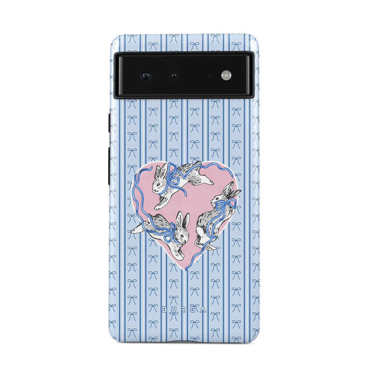They run, you chase. Or maybe you run, and they chase you. The Follow Me Google Pixel 6 phone case design is an eternal loop—white rabbits tangled in pink ribbons, leading you somewhere unknown. Or maybe, somewhere you’ve already been.