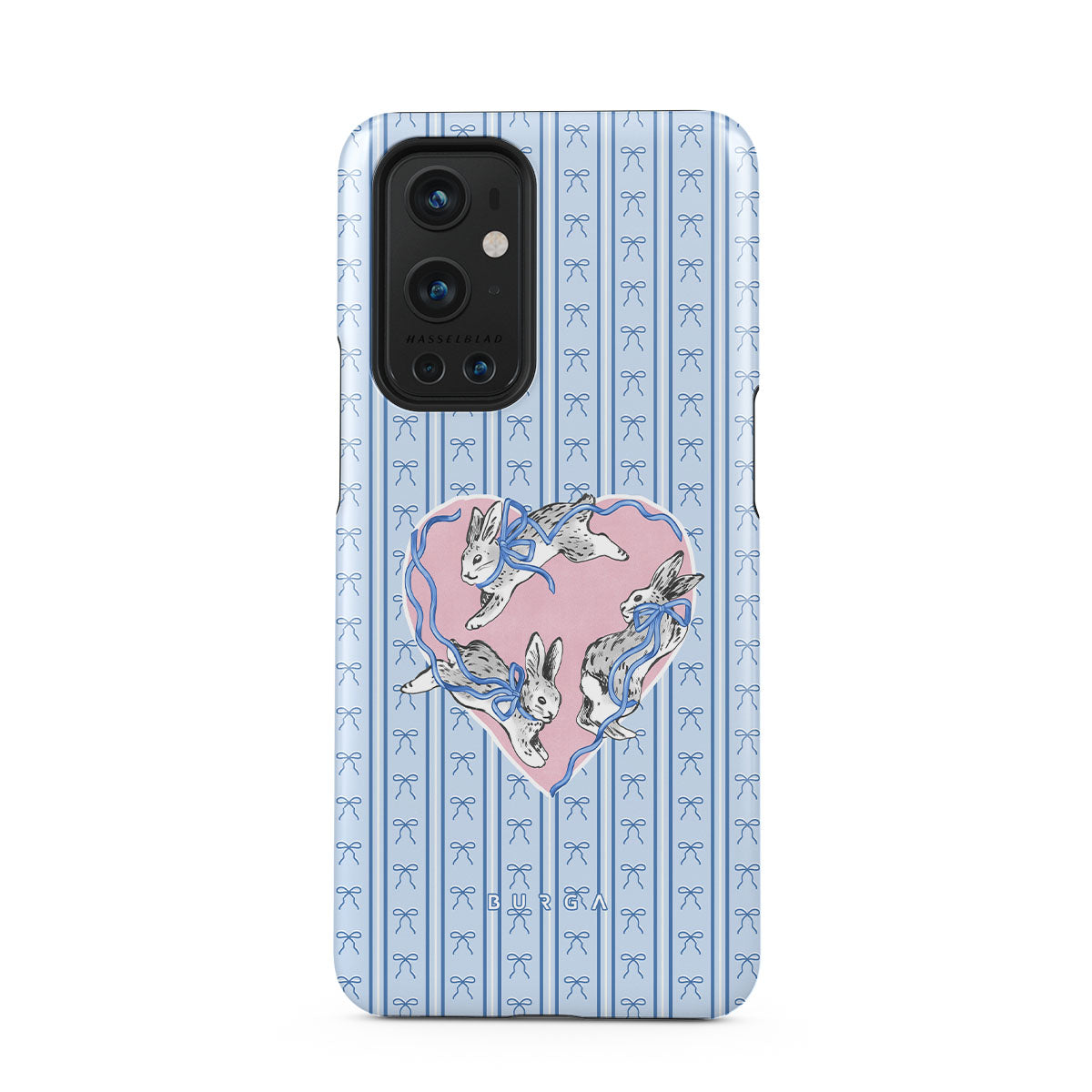 This design features: white rabbits, heart frame, blue stripes