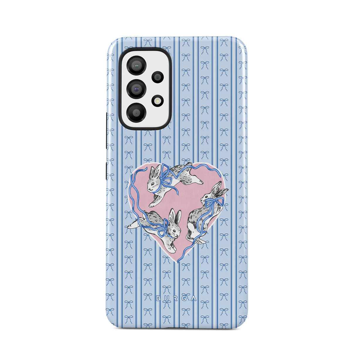 They run, you chase. Or maybe you run, and they chase you. The Follow Me Samsung Galaxy A53 phone case design is an eternal loop—white rabbits tangled in pink ribbons, leading you somewhere unknown. Or maybe, somewhere you’ve already been.