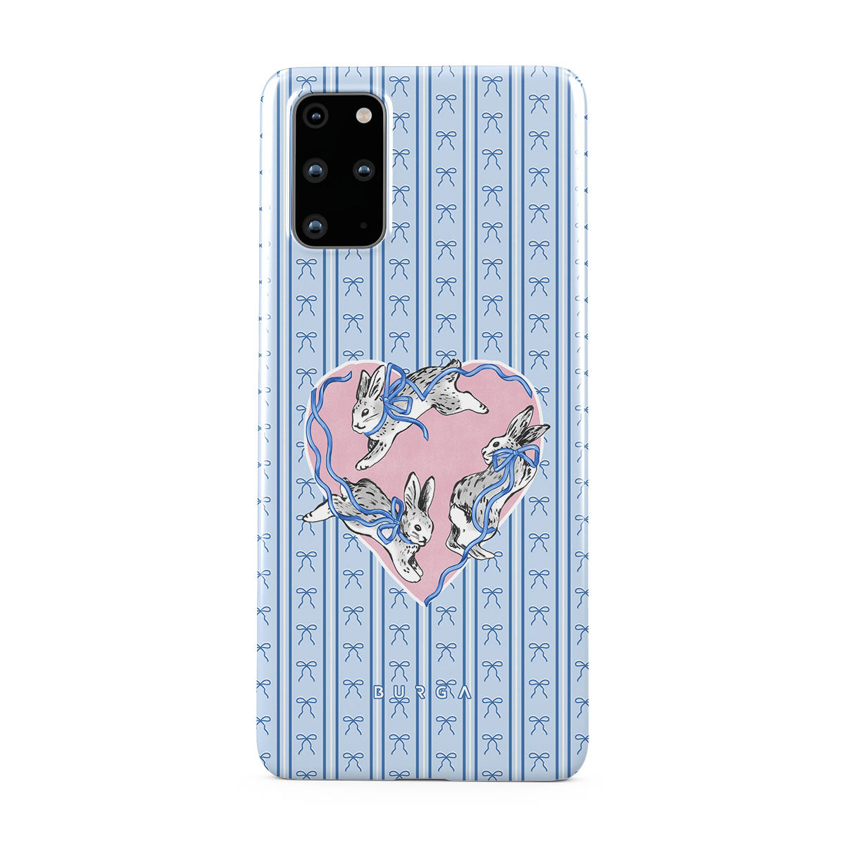 This design features: white rabbits, heart frame, blue stripes