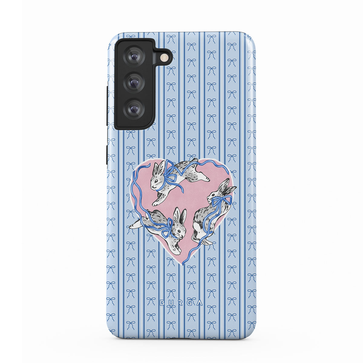 They run, you chase. Or maybe you run, and they chase you. The Follow Me Samsung Galaxy S21 FE phone case design is an eternal loop—white rabbits tangled in pink ribbons, leading you somewhere unknown. Or maybe, somewhere you’ve already been.