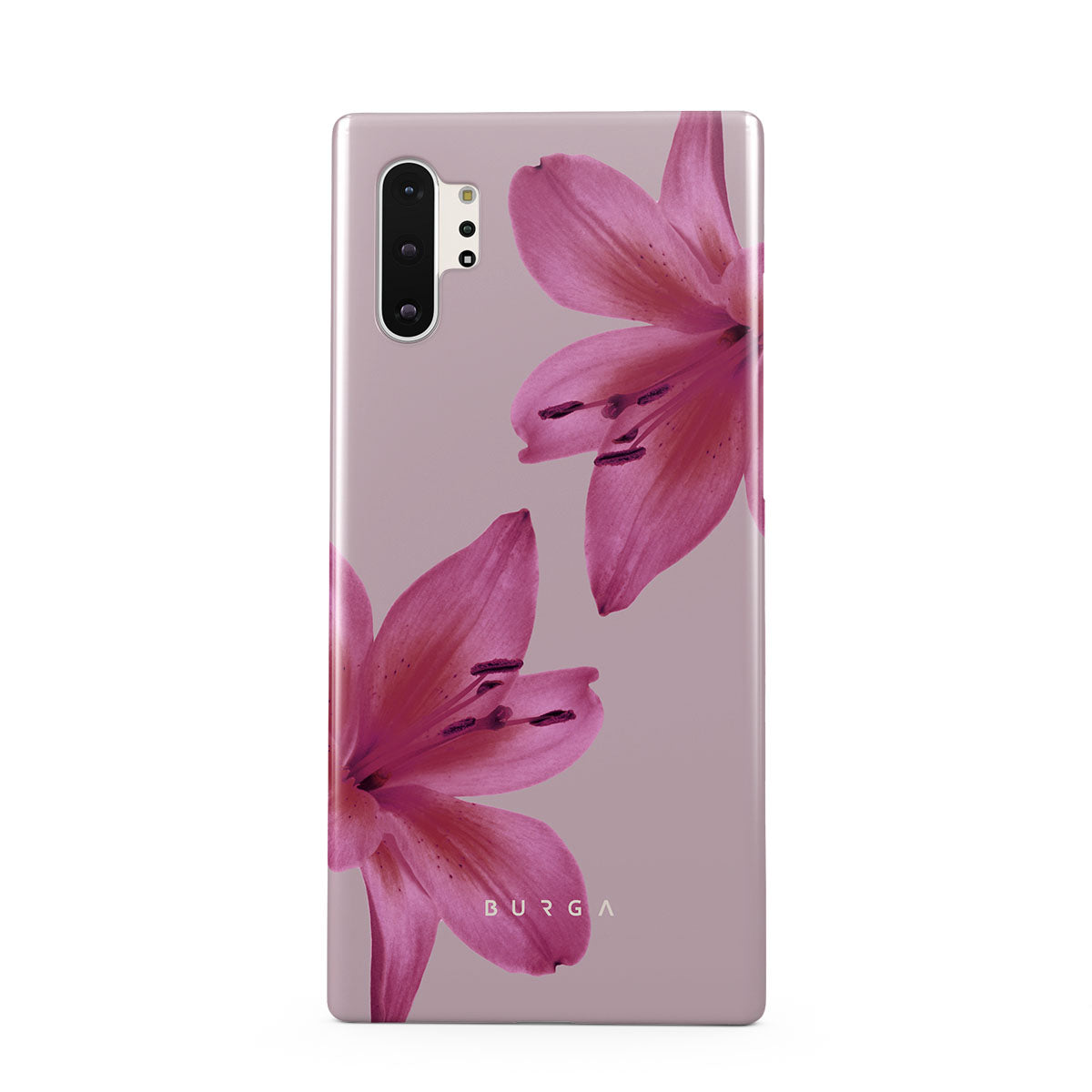 A gentle hush of pink forms where soft lilies sway. Their tender petals — a silent ode to the delicate dance of life. The Fragile Beauty Samsung Galaxy Note 10 Plus phone case design invites you to lean into the soft embrace of nature, letting its subtle rhythms guide your journey.
