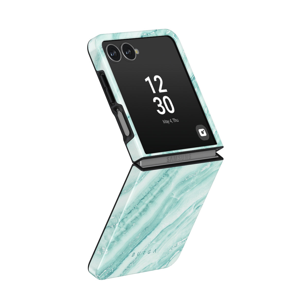 Add freshness to your style with our Fresh Breeze Samsung Galaxy Z Flip 7 phone case. The soft cyan color of the case is emphasized in a unique marble pattern. Do not let the softness of the color deceive you; the case still offers heavy-duty protection for your cellphone.
