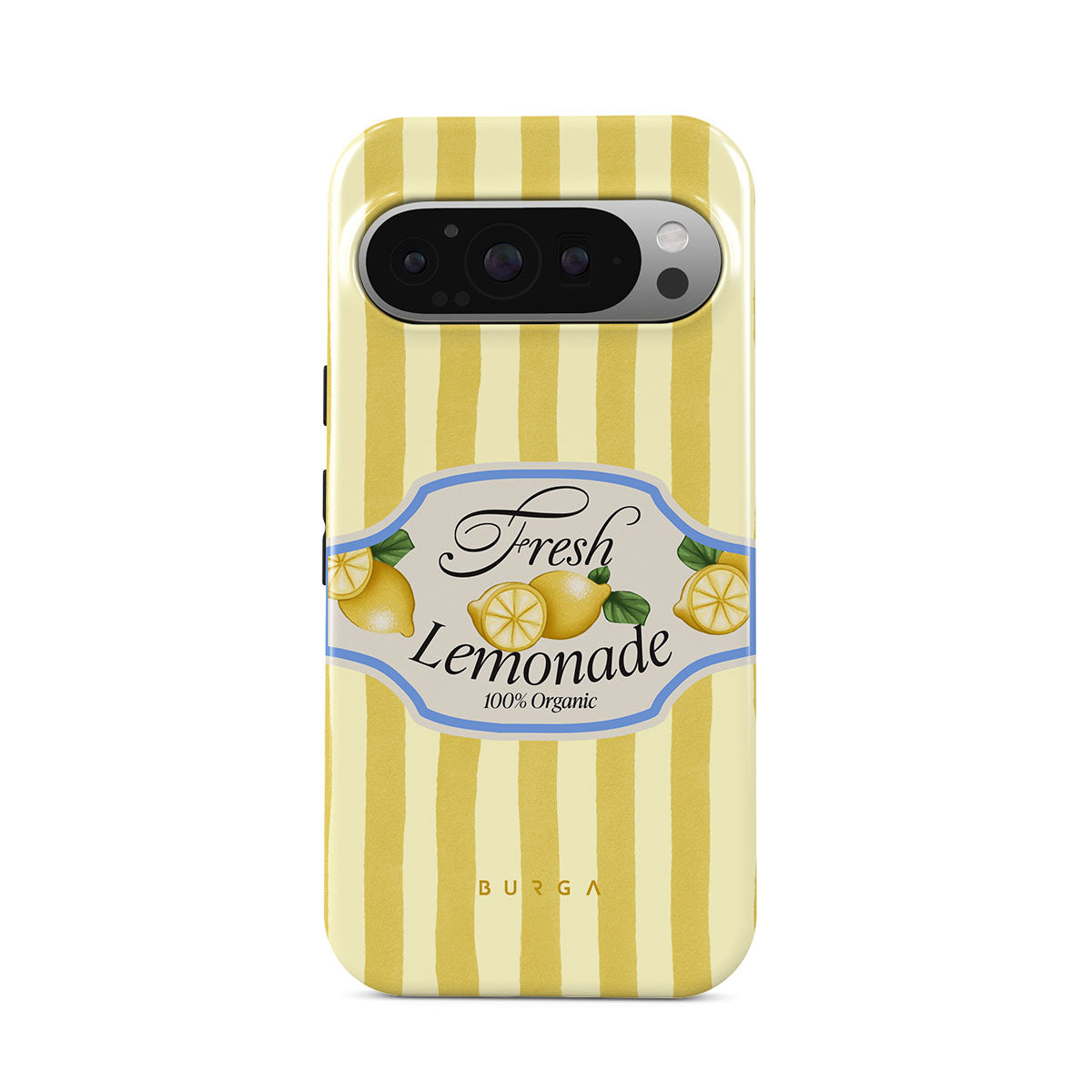 This design features: lemons, yellow stripes, playful graphics