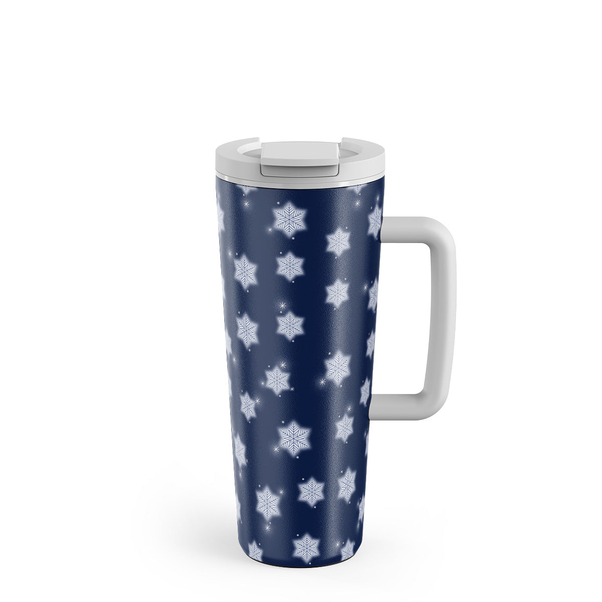 This design features: white snowflakes, navy blue background, winter snowflake pattern, geometric snowflakes, classic winter design