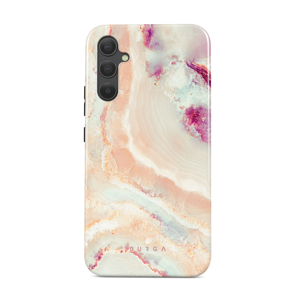 The soft color scheme of coral, pink, blue, and purple of our Berry Sorbet Samsung Galaxy A34 phone case radiates soft girly vibes. The feminine touch is felt throughout the design, making it an excellent choice to add to the springtime wardrobe and protect your phone from scratches and falls.