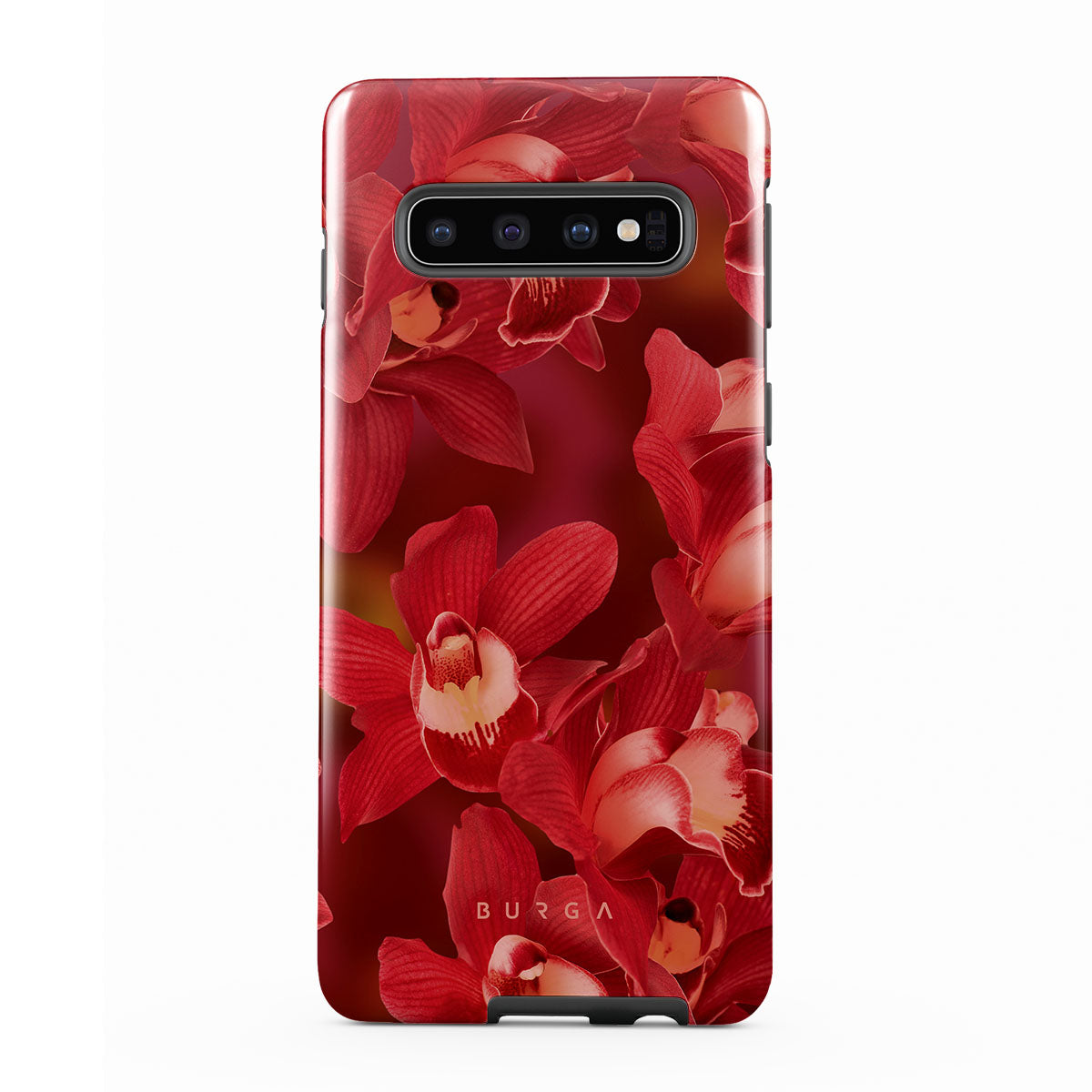 The deep red orchids emerge with a passionate intensity, evoking the fervor and depth of emotions that come with fully experiencing life. They are a vibrant call to embrace every heartbeat, to live deeply and love boldly. Discover the Goddess Energy Samsung Galaxy S10 4G phone case design.