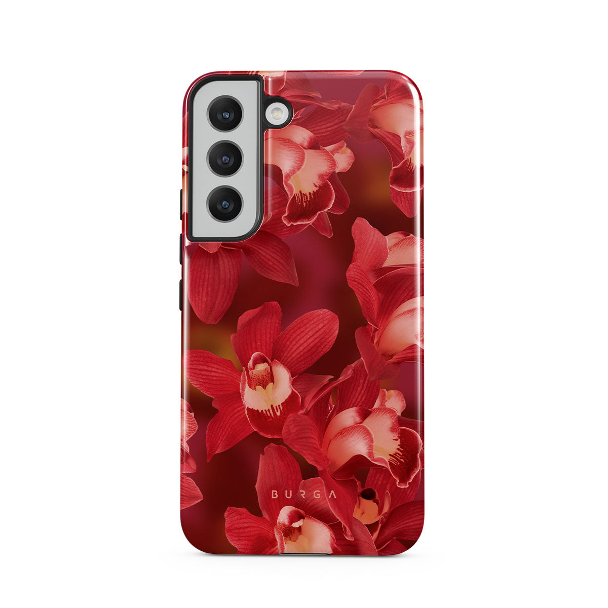 The deep red orchids emerge with a passionate intensity, evoking the fervor and depth of emotions that come with fully experiencing life. They are a vibrant call to embrace every heartbeat, to live deeply and love boldly. Discover the Goddess Energy Samsung Galaxy S22 phone case design.