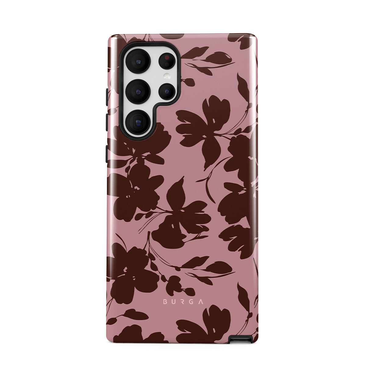 Quietly bold, our Gossip Samsung Galaxy S22 Ultra phone case design speaks volumes in subtlety. A soft rosé background, layered with deep red-brown floral accents, gives off a refined, almost mysterious vibe. It's for those who let the details do the talking.