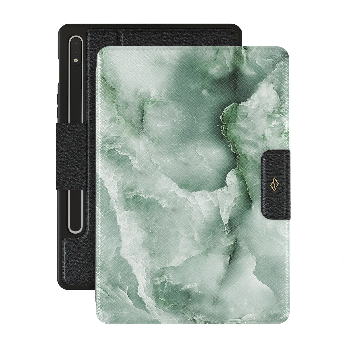 Our Pistachio Cheesecake Samsung Galaxy Tab S8/S7 folio case is inspired by the soft green color of pistachios. The marble pattern never goes out of style, and reimagined design with pastel green and white swirls offers a designer feel. Such a hard-shell case will provide heavy-duty protection while adding a touch of pastel to your collection.