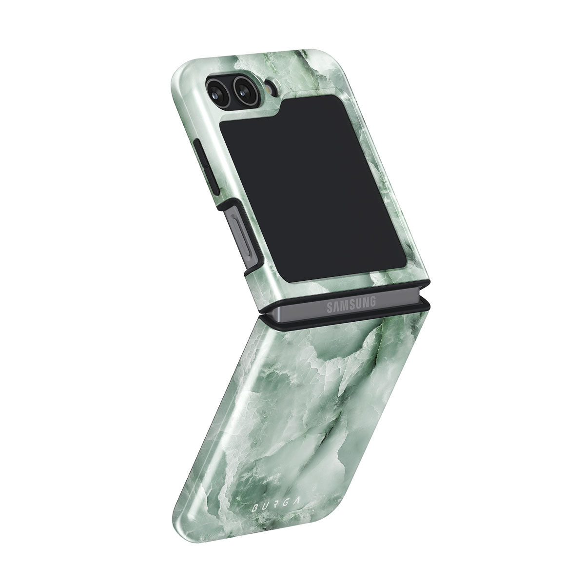 Our Pistachio Cheesecake Samsung Galaxy Z Flip 5 phone case is inspired by the soft green color of pistachios. The marble pattern never goes out of style, and reimagined design with pastel green and white swirls offers a designer feel. Such a hard-shell case will provide heavy-duty protection while adding a touch of pastel to your collection.
