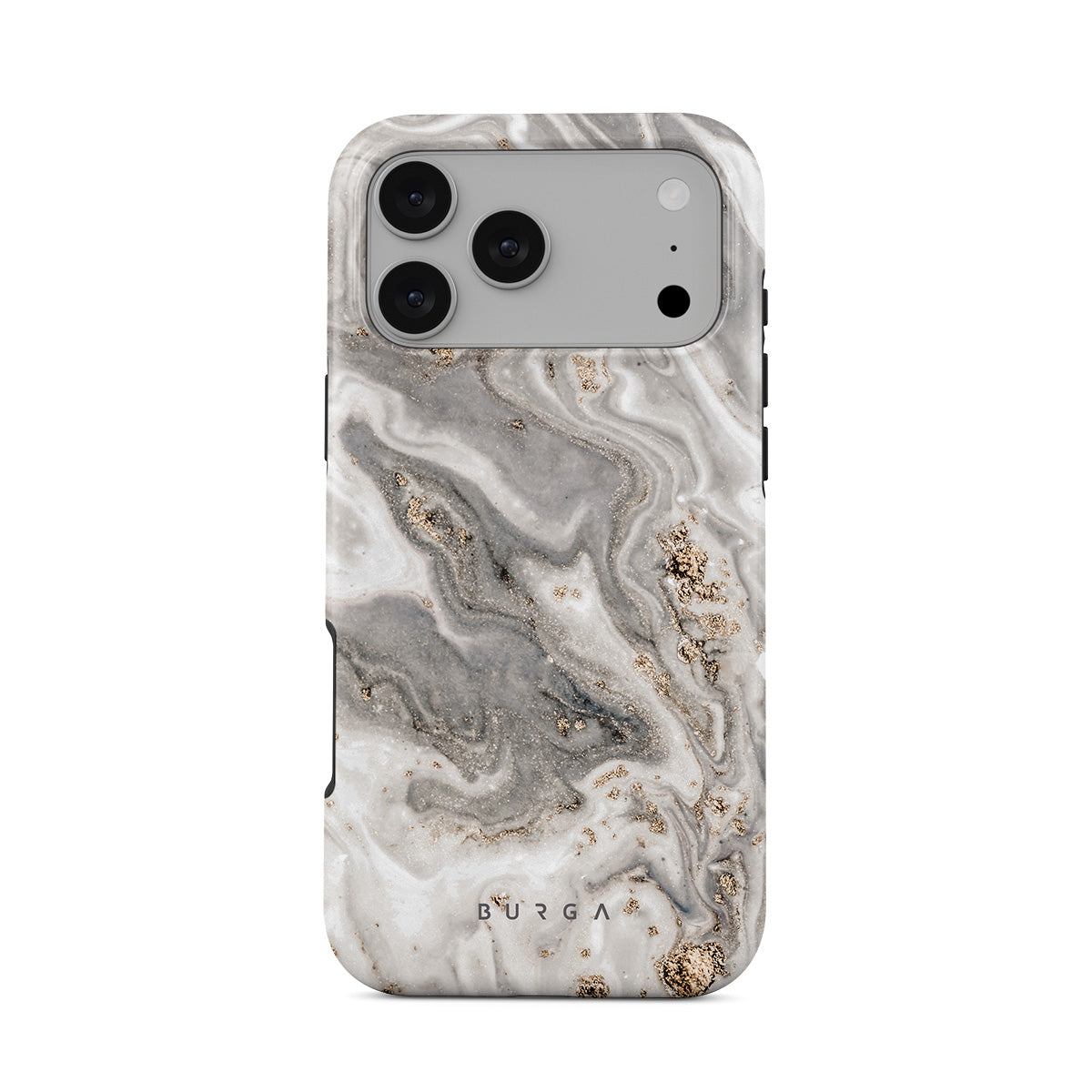 The wind outside is playing his songs. Some fear, some love, and some simply enjoy. But do not be afraid, with our grey marble iPhone 17 Pro Max phone case inspired by a beautiful snowstorm, you can have the pretty part of it without any coldness. And as the case offers heavy-duty protection, your phone will also be safe and sound!