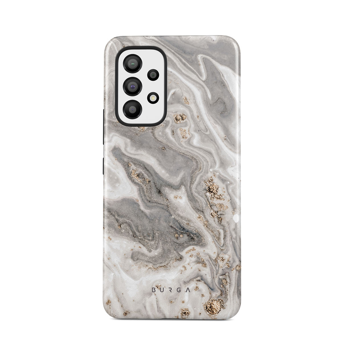 The wind outside is playing his songs. Some fear, some love, and some simply enjoy. But do not be afraid, with our grey marble Samsung Galaxy A33 phone case inspired by a beautiful snowstorm, you can have the pretty part of it without any coldness. And as the case offers heavy-duty protection, your phone will also be safe and sound!