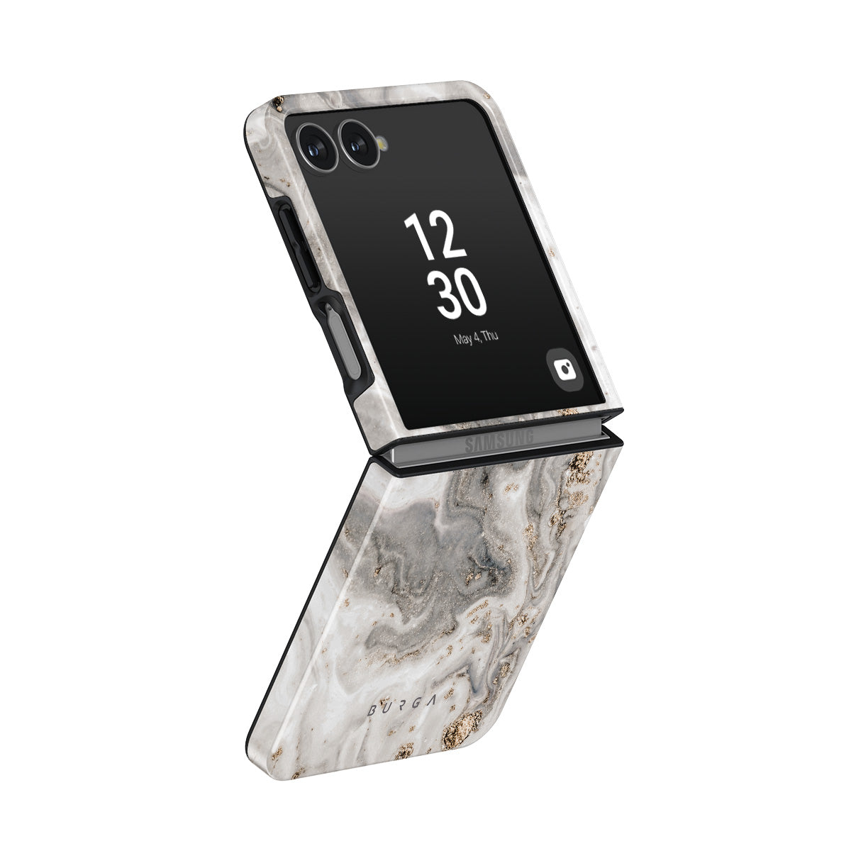 The wind outside is playing his songs. Some fear, some love, and some simply enjoy. But do not be afraid, with our grey marble Samsung Galaxy Z Flip 7 phone case inspired by a beautiful snowstorm, you can have the pretty part of it without any coldness. And as the case offers heavy-duty protection, your phone will also be safe and sound!