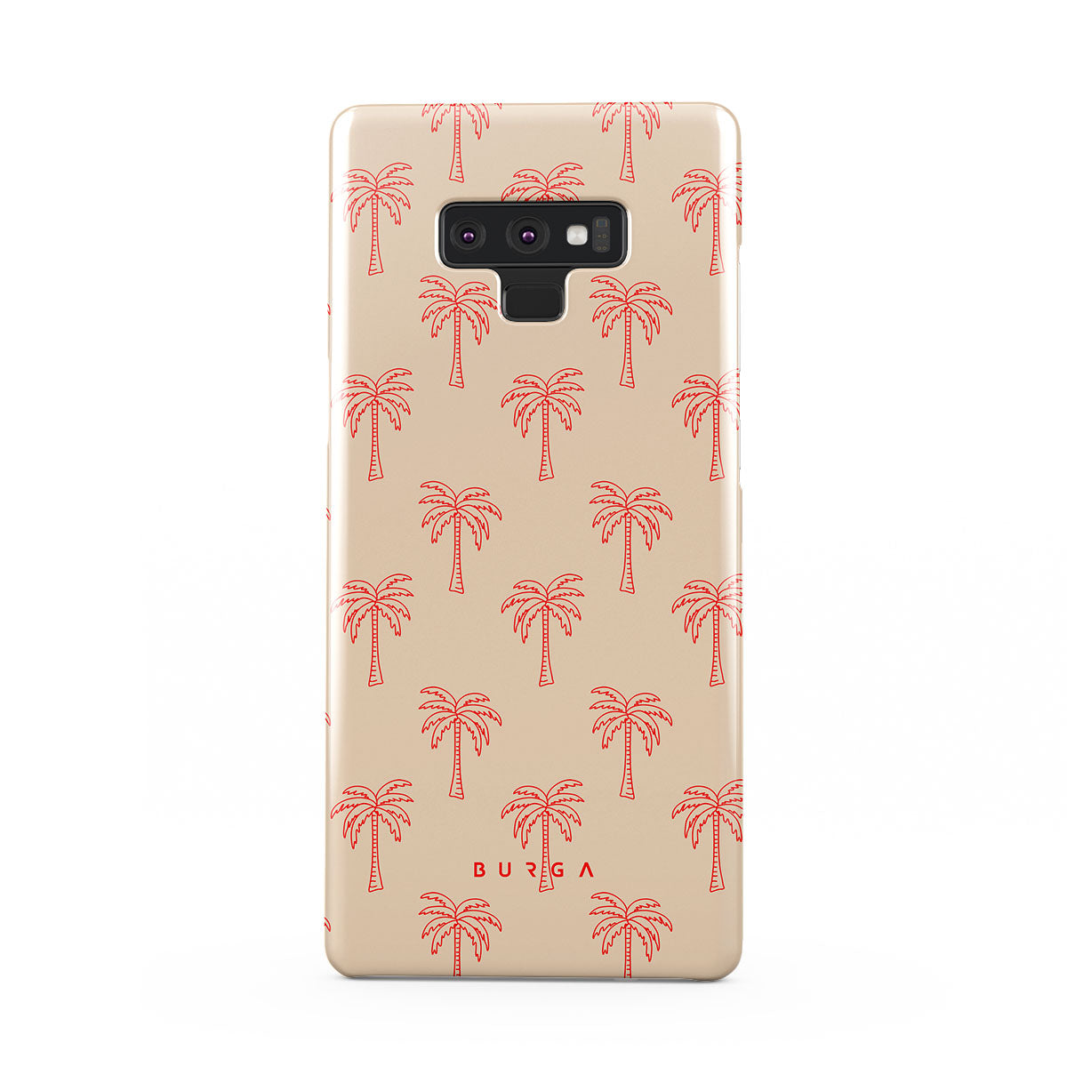 Retreat into the serene whispers of our Happy Hour design. Gentle pink palms sway on a soothing blush background, creating images of a tranquil paradise. This Samsung Galaxy Note 9 phone case is perfect for dreamers and nature lovers who seek a daily escape into tranquility.