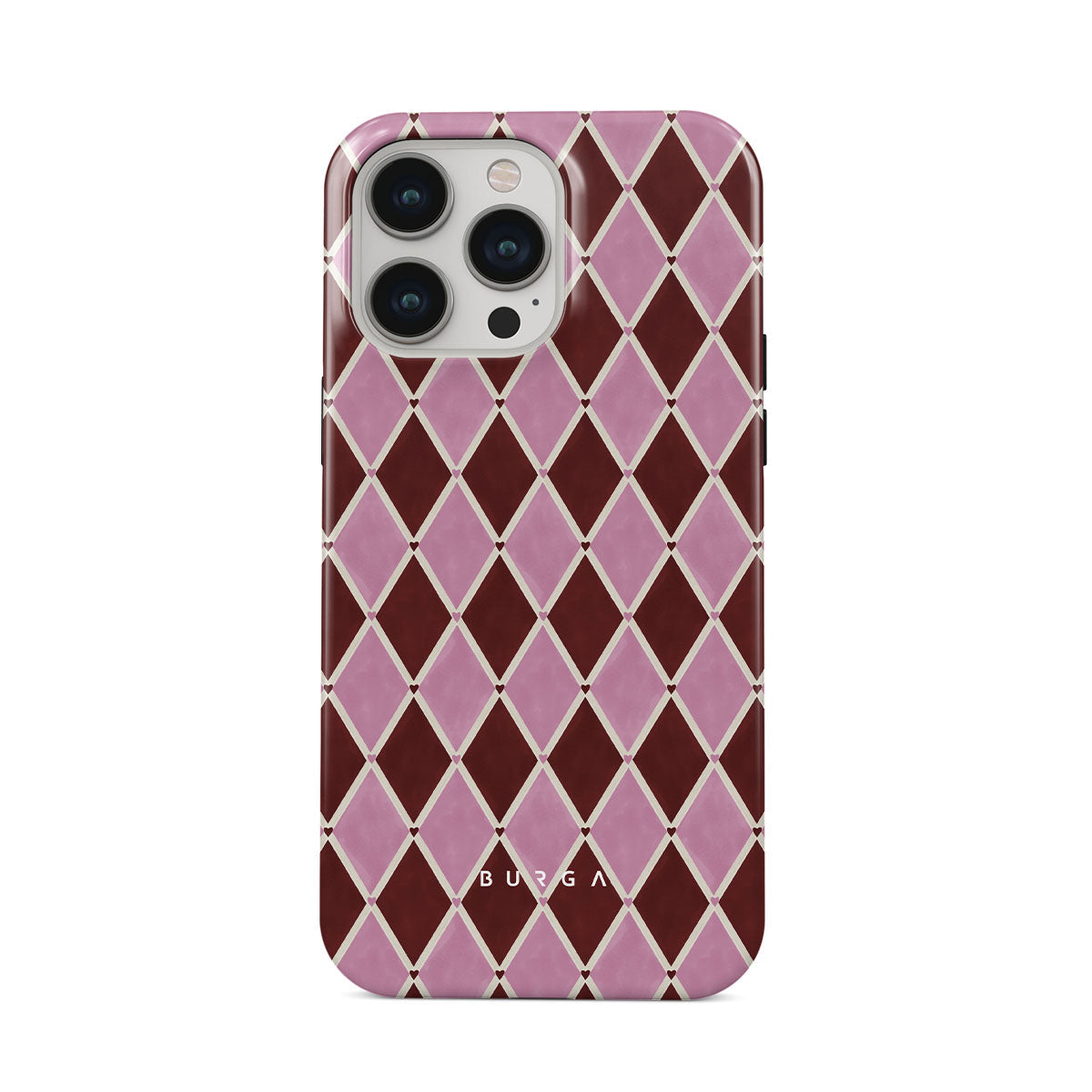 This design features: harlequin pattern, pink diamonds, deep red background