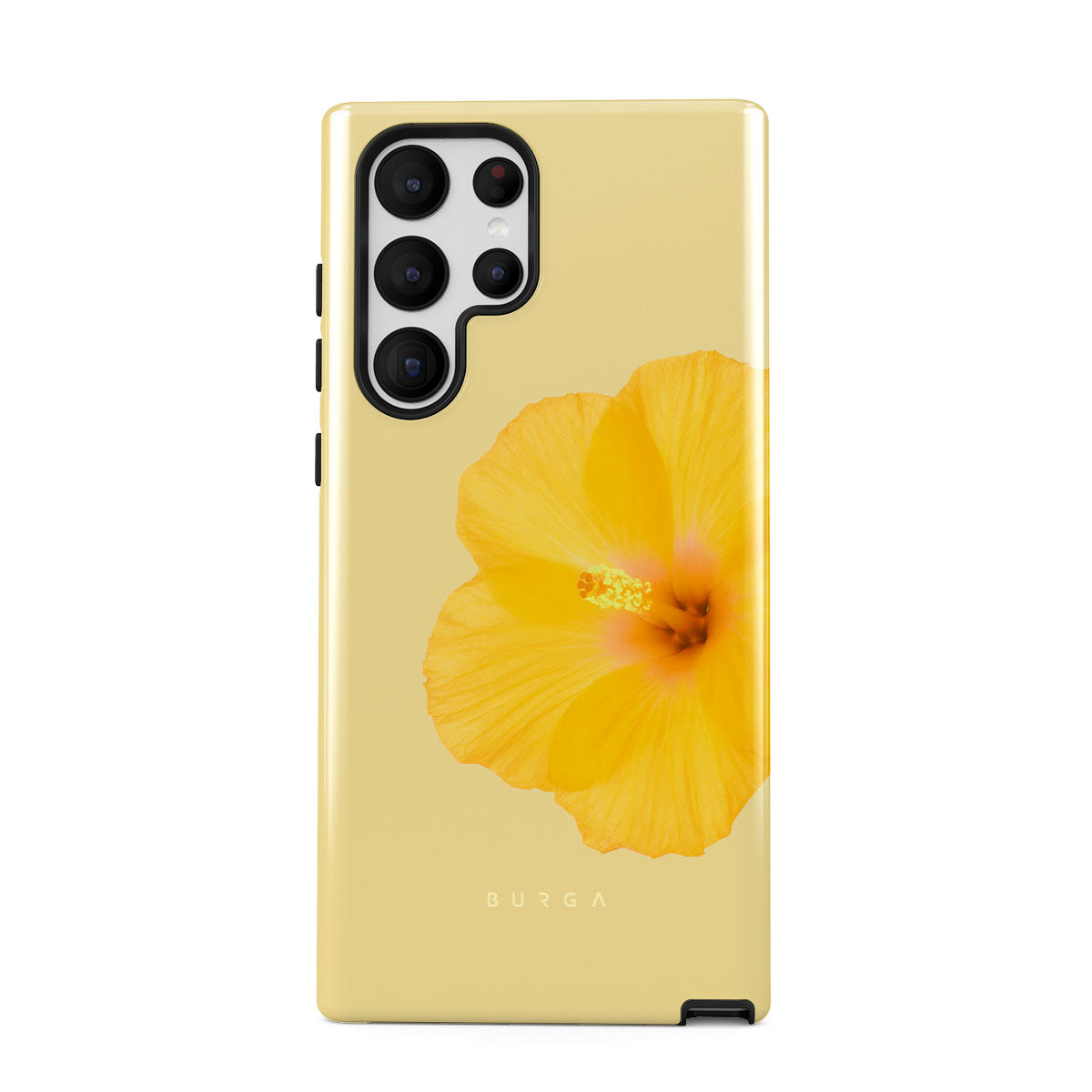 Our bright yellow Samsung Galaxy S22 Ultra phone case features bold, beautiful flowers that evoke a sense of nostalgia and happiness. This cheerful floral design captures the essence of joyful moments, making your device a reminder of sunny memories. Perfect for brightening up your day.