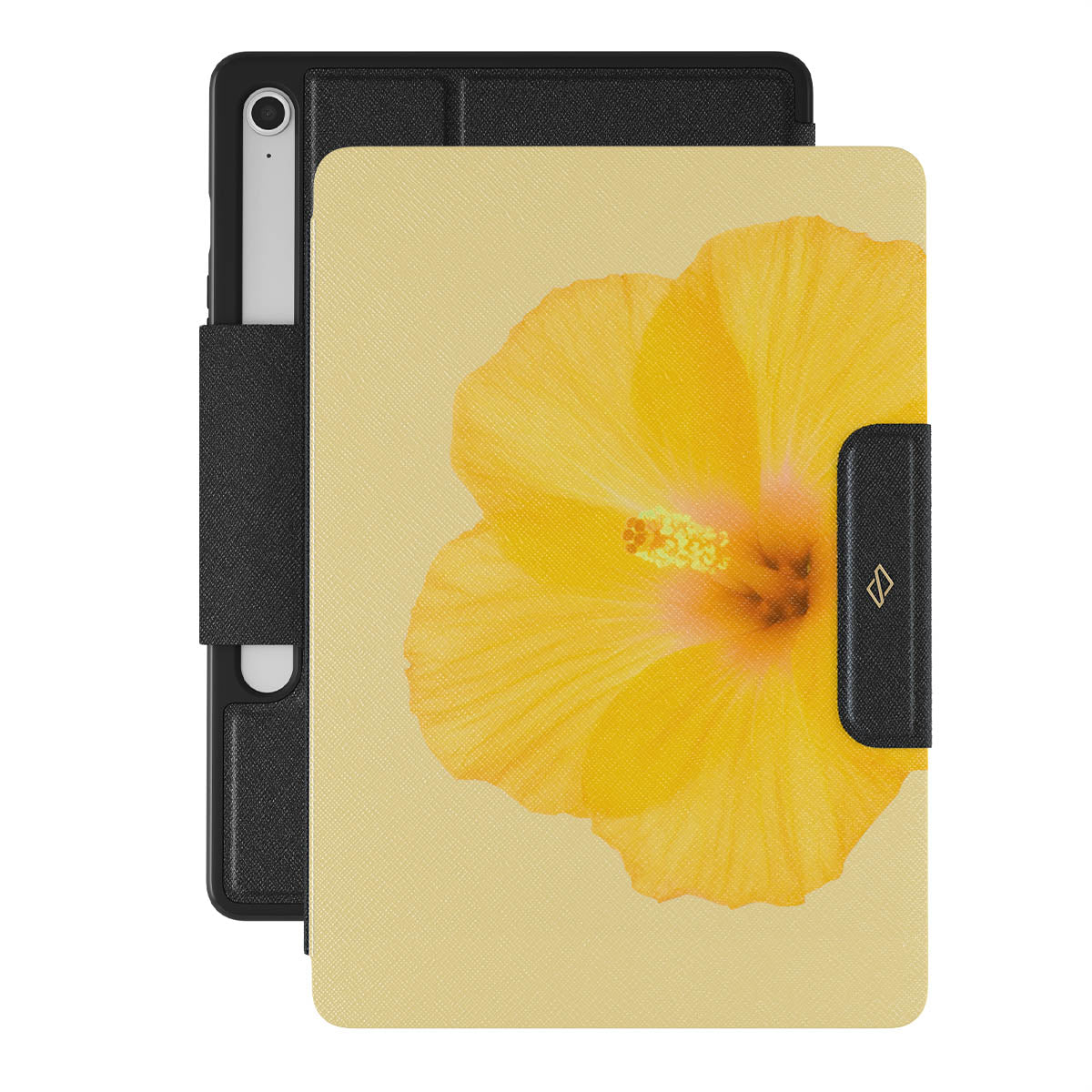 Our Hibiscus Samsung Galaxy Tab S10 FE folio case features a striking design with a large, vibrant yellow hibiscus flower on a matching yellow background. This tropical flower pattern exudes a sense of warmth and exotic beauty, perfect for those who love nature-inspired and floral aesthetics.
