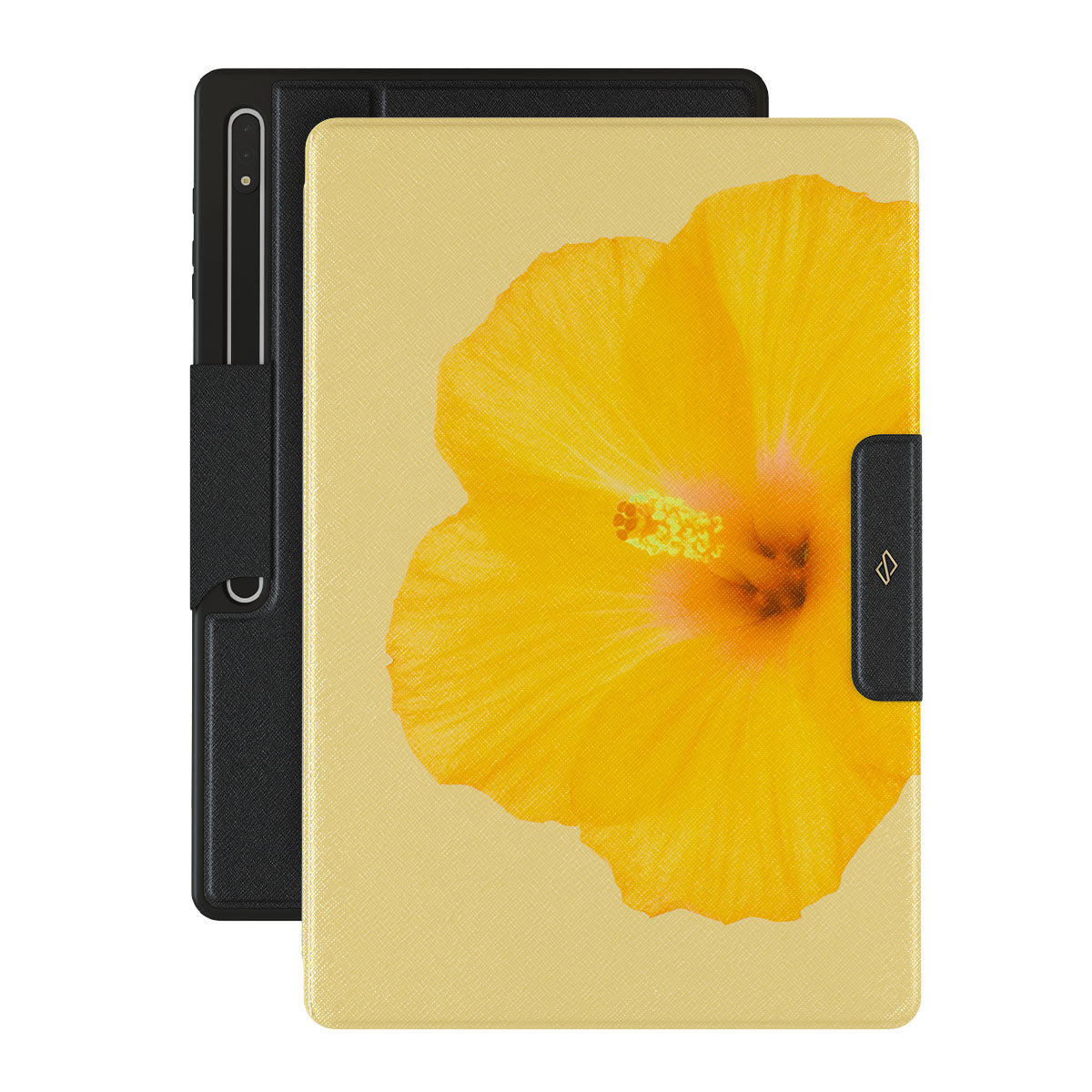 Our Hibiscus Samsung Galaxy Tab S9 Ultra folio case features a striking design with a large, vibrant yellow hibiscus flower on a matching yellow background. This tropical flower pattern exudes a sense of warmth and exotic beauty, perfect for those who love nature-inspired and floral aesthetics.