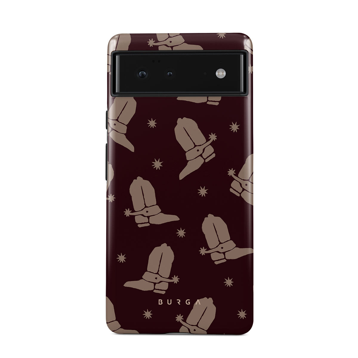 Say Howdy to this charming Google Pixel 6a phone case design. Cowboy boots and stars dance across a deep brown background, celebrating the essence of western life. Perfect for those who embrace their free spirit.