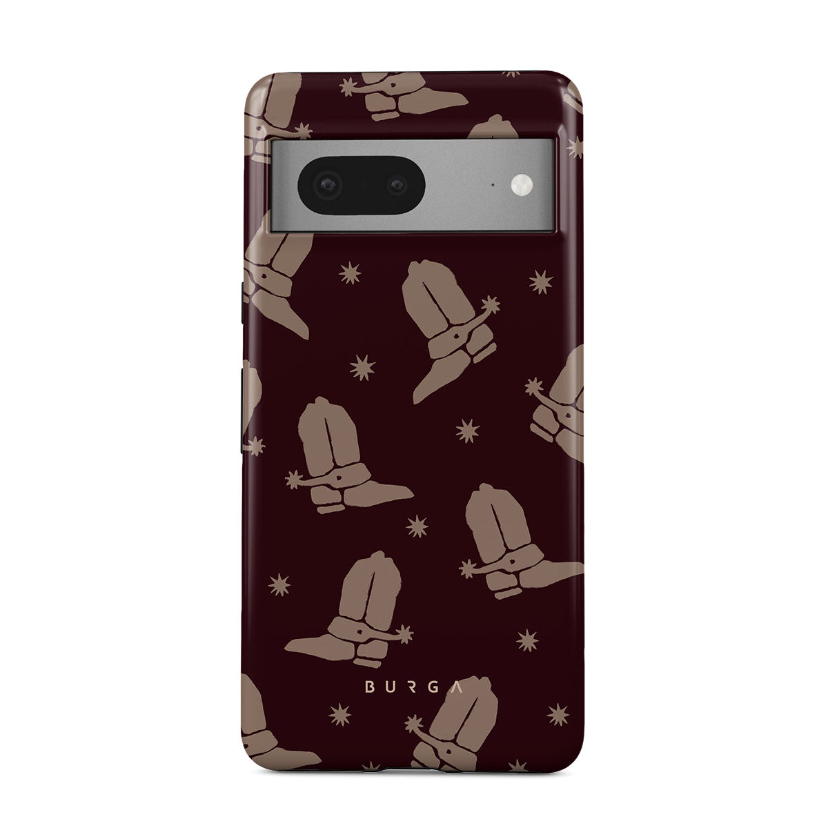 Say Howdy to this charming Google Pixel 7 phone case design. Cowboy boots and stars dance across a deep brown background, celebrating the essence of western life. Perfect for those who embrace their free spirit.
