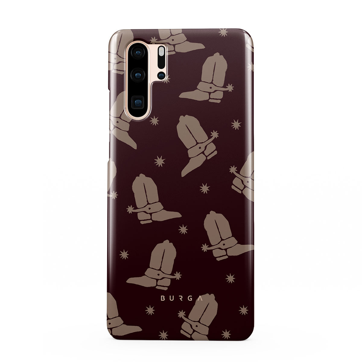 Say Howdy to this charming Huawei P30 Pro phone case design. Cowboy boots and stars dance across a deep brown background, celebrating the essence of western life. Perfect for those who embrace their free spirit.