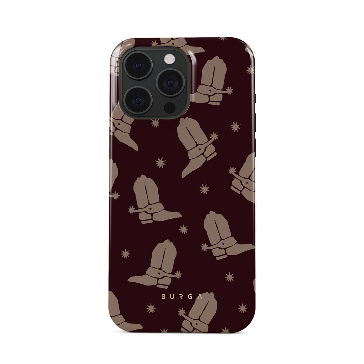 Say Howdy to this charming iPhone 15 Pro phone case design. Cowboy boots and stars dance across a deep brown background, celebrating the essence of western life. Perfect for those who embrace their free spirit.