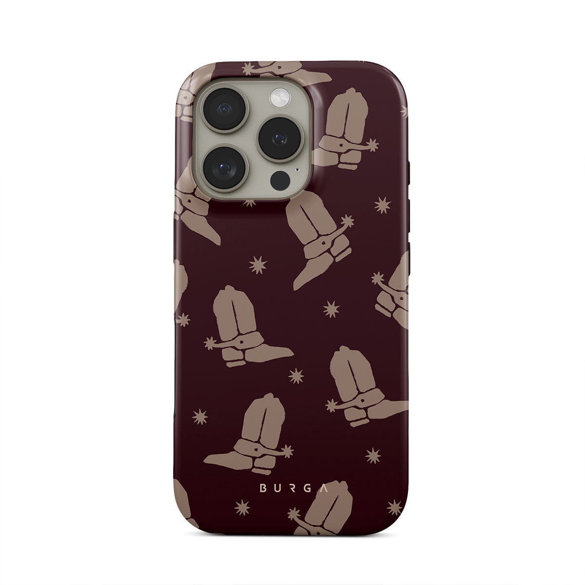 Say Howdy to this charming iPhone 16 Pro phone case design. Cowboy boots and stars dance across a deep brown background, celebrating the essence of western life. Perfect for those who embrace their free spirit.