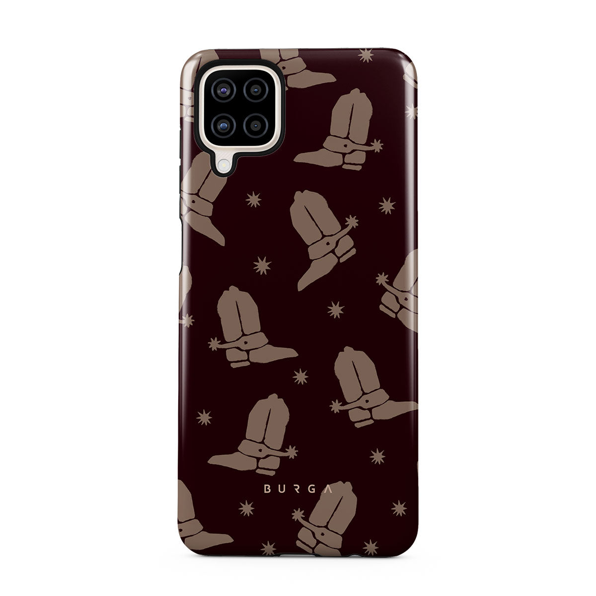 Say Howdy to this charming Samsung Galaxy A12 4G phone case design. Cowboy boots and stars dance across a deep brown background, celebrating the essence of western life. Perfect for those who embrace their free spirit.