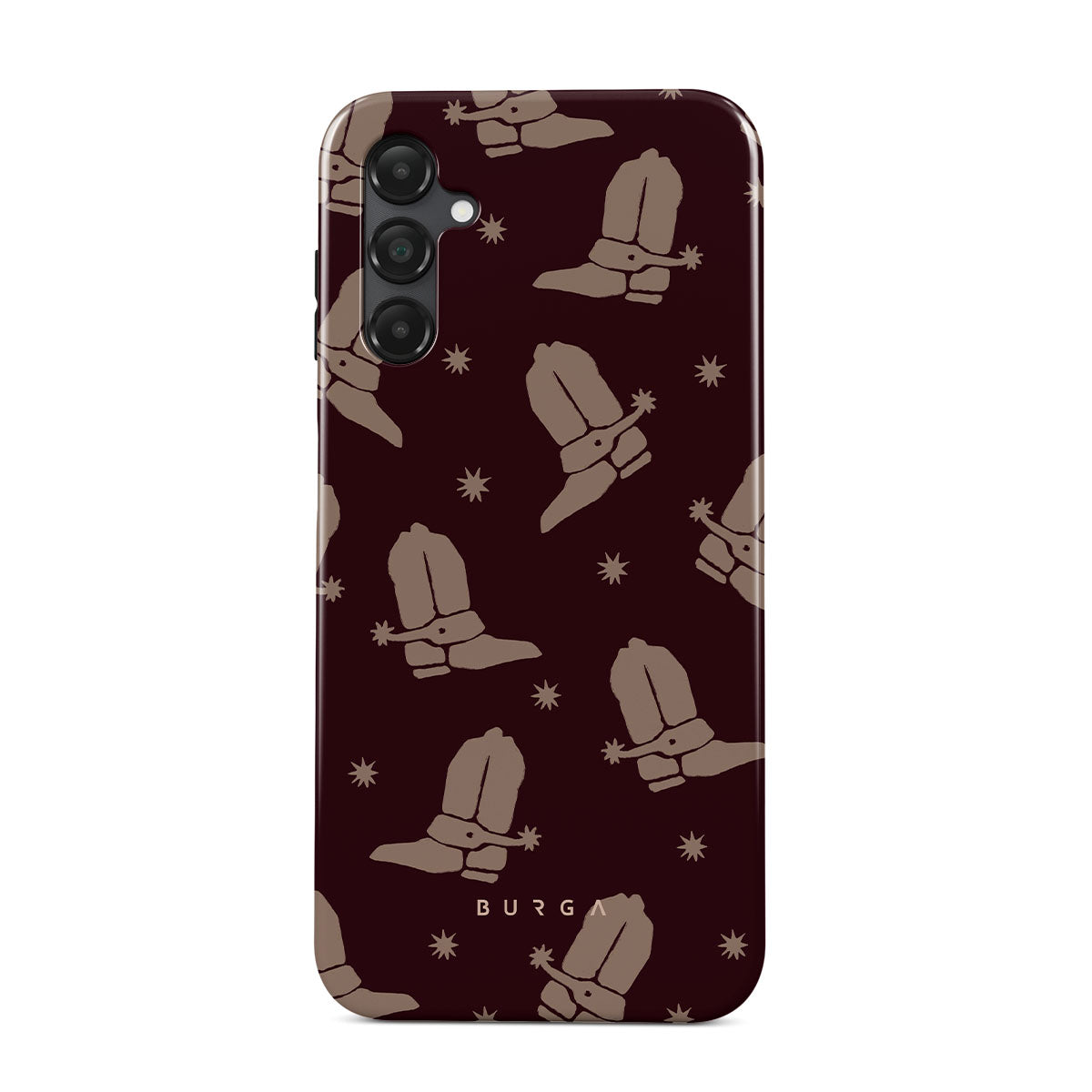 Say Howdy to this charming Samsung Galaxy A25 phone case design. Cowboy boots and stars dance across a deep brown background, celebrating the essence of western life. Perfect for those who embrace their free spirit.